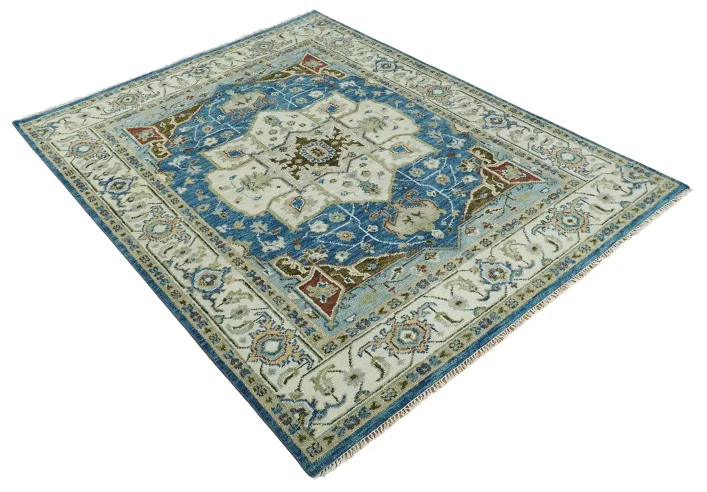 This Hand-Knotted Rug has been Made with Handspun Wool. The beautiful colors and design of the rug carry a legacy of heirloom rugs. The large design of the rug completes your space without making it look busy. The rug is durable and can last for decades if treated right. Hand-Knotted Made with Wool Made to order in 30-45 Days Color: Blue and Ivory Made with 18 knots per square inch This specific rug is made in India, in the city of Bhadohi. Bhadohi is one of the biggest rug manufacturing cities. Carpet weaving in the region dates back to the 16th century during the reign of Akbar. The skilled artisans of Bhadohi have been carrying the tradition of rug-making for centuries. USERS GUIDE Avoid prolonged moisture Vacuum regularly and/or shake to remove dust Do not pull any loose threads. Use scissors to simply cut the ends Blot spills immediately with a white cloth. Harsh chemicals may damage or fade the rug Use rug protectors under heavy furniture