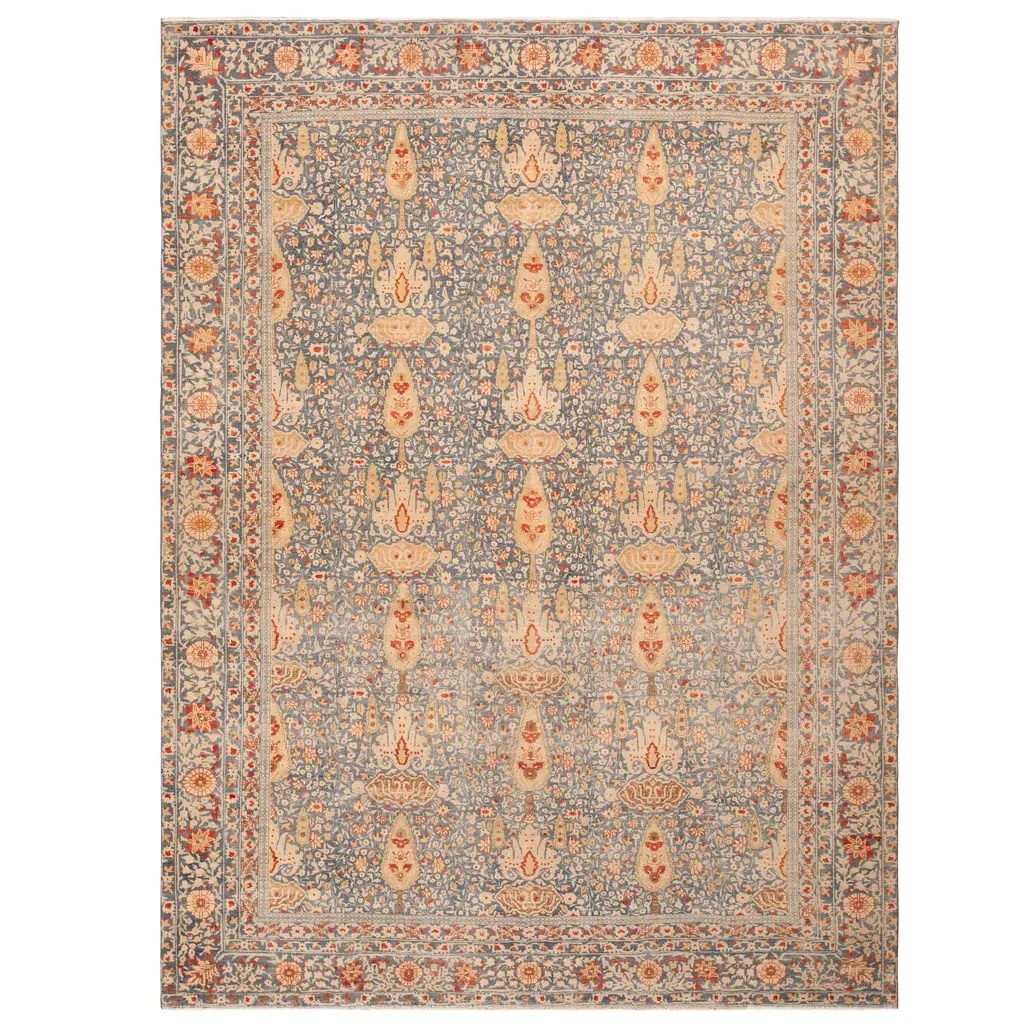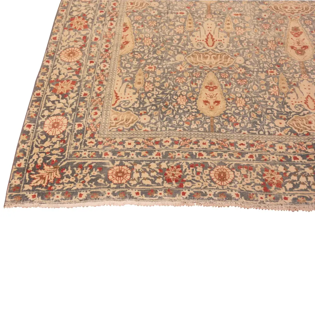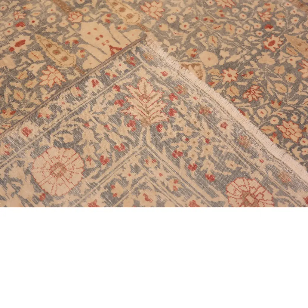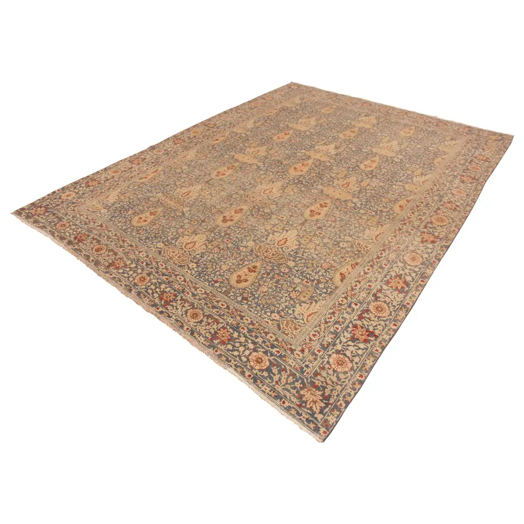 The Blue & Red Antique Persian Tabriz Wool Rug measures 7'8" x 10'1" and originates from Iran. This hand-knotted masterpiece showcases symmetrical patterns in shades of greyish-blue, cream, orange, and dark blue. Intricate floral and paisley motifs adorn the central designs, surrounded by traditional Persian patterns. The high level of craftsmanship and use of wool suggest a luxurious and durable quality.