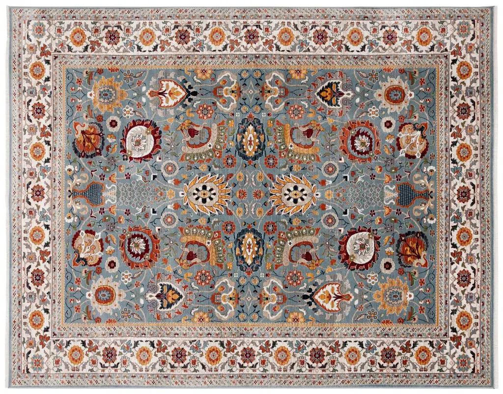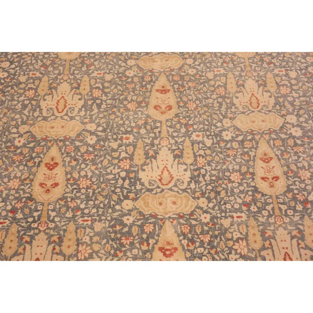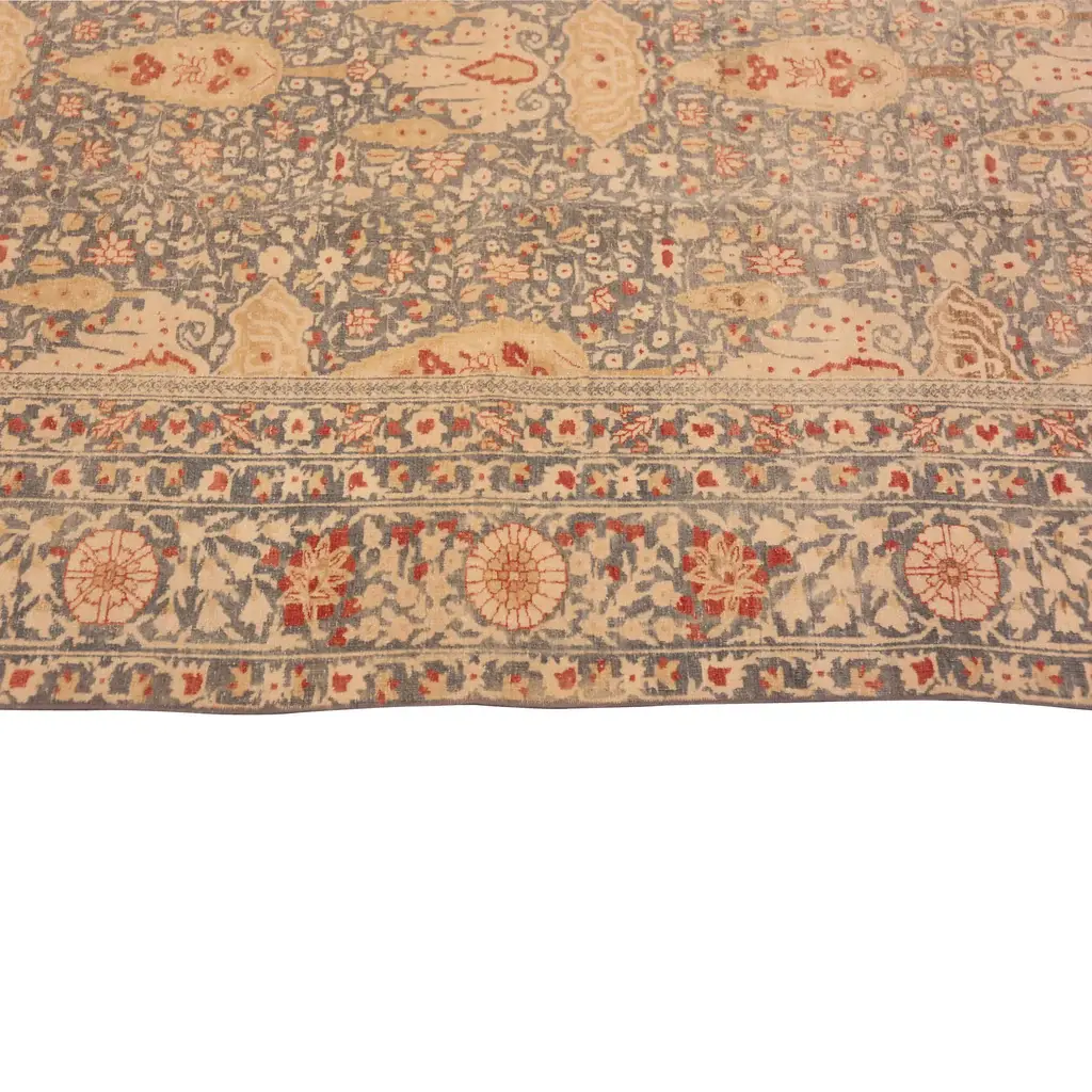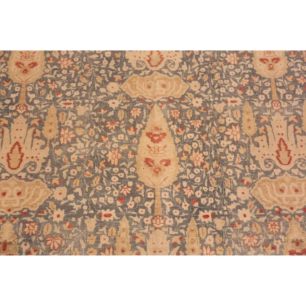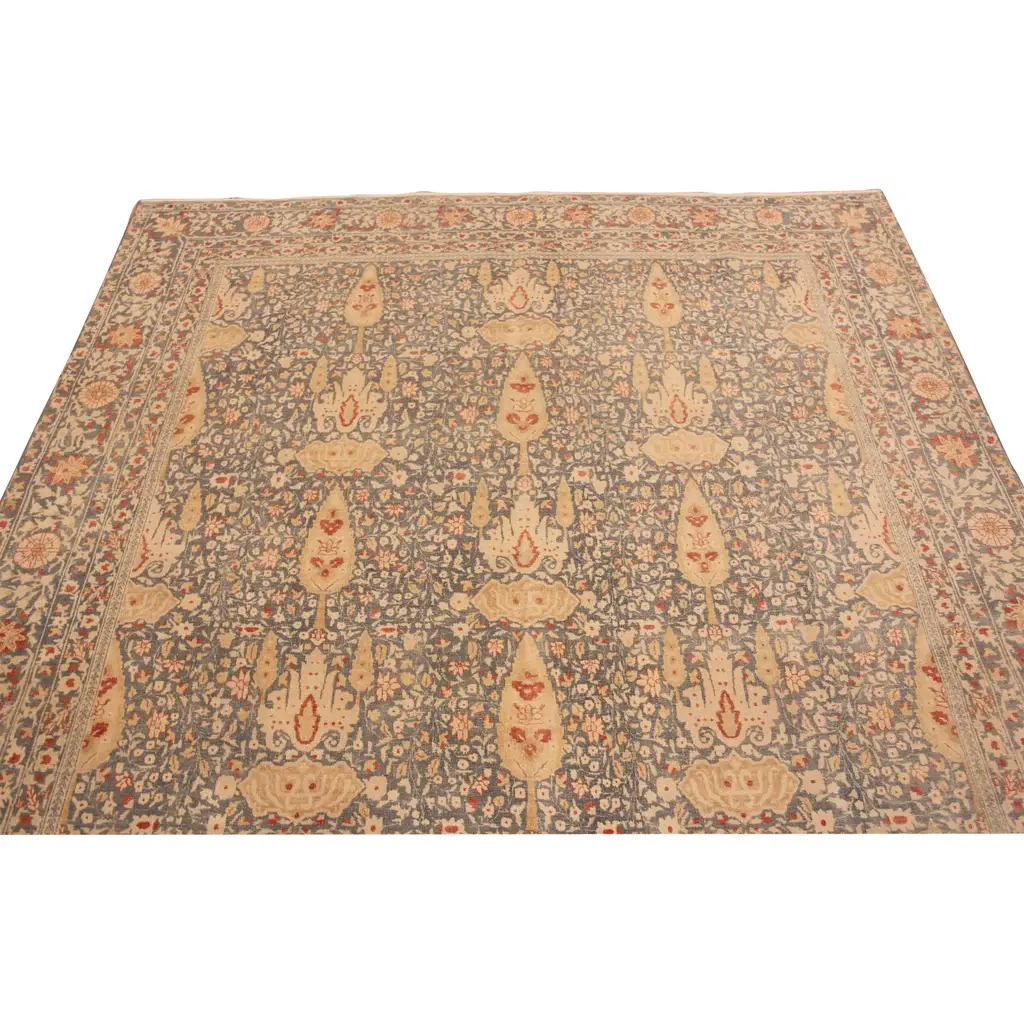 The Blue & Red Antique Persian Tabriz Wool Rug measures 7'8" x 10'1" and originates from Iran. This hand-knotted masterpiece showcases symmetrical patterns in shades of greyish-blue, cream, orange, and dark blue. Intricate floral and paisley motifs adorn the central designs, surrounded by traditional Persian patterns. The high level of craftsmanship and use of wool suggest a luxurious and durable quality.