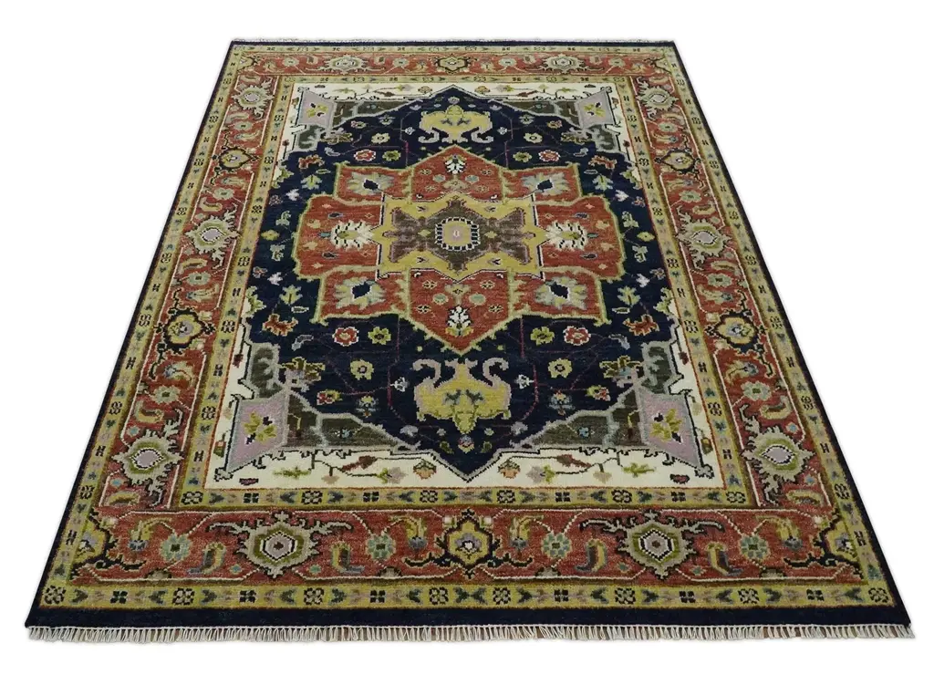 This Hand-Knotted Rug has been Made with Handspun Wool. The beautiful colors of the rug carry a legacy of the famous Heriz rug, the traditional design of the rug completes your space without making it look busy. Hand-Knotted rugs are durable and can last for decades if treated right. Hand-Knotted Rug ALL SIZES ARE MADE TO ORDER IN 30-45 DAYS Made with Wool Color: Navy Blue and Rust Made with 22 knots per square inch This specific rug is made in India, in the city of Bhadohi. Bhadohi is one of the biggest rug manufacturing cities. Carpet weaving in the region dates back to the 16th century during the reign of Akbar. The skilled artisans of Bhadohi have been carrying the tradition of rug-making for centuries. USERS GUIDE Avoid prolonged moisture Vacuum regularly and/or shake to remove dust Do not pull any loose threads. Use scissors to simply cut the ends Blot spills immediately with a white cloth. Harsh chemicals may damage or fade the rug Use rug protectors under heavy furniture