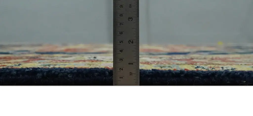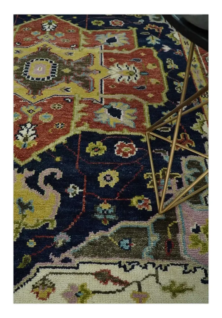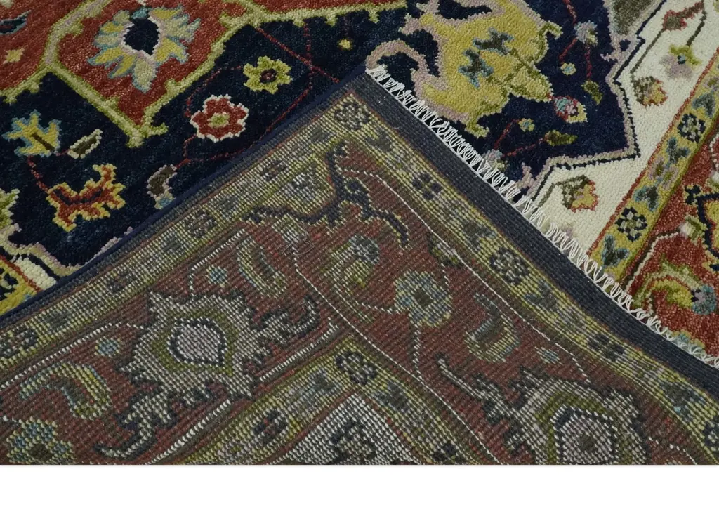 This Hand-Knotted Rug has been Made with Handspun Wool. The beautiful colors of the rug carry a legacy of the famous Heriz rug, the traditional design of the rug completes your space without making it look busy. Hand-Knotted rugs are durable and can last for decades if treated right. Hand-Knotted Rug ALL SIZES ARE MADE TO ORDER IN 30-45 DAYS Made with Wool Color: Navy Blue and Rust Made with 22 knots per square inch This specific rug is made in India, in the city of Bhadohi. Bhadohi is one of the biggest rug manufacturing cities. Carpet weaving in the region dates back to the 16th century during the reign of Akbar. The skilled artisans of Bhadohi have been carrying the tradition of rug-making for centuries. USERS GUIDE Avoid prolonged moisture Vacuum regularly and/or shake to remove dust Do not pull any loose threads. Use scissors to simply cut the ends Blot spills immediately with a white cloth. Harsh chemicals may damage or fade the rug Use rug protectors under heavy furniture