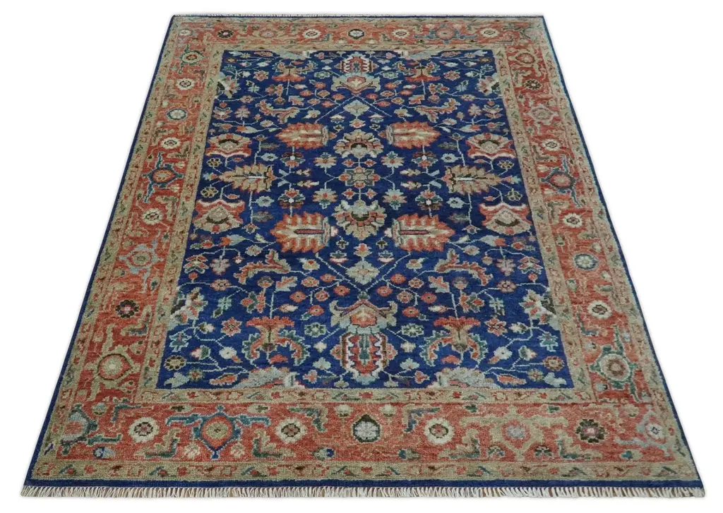 This custom made, hand knotted traditional Oushak wool rug features a striking floral pattern in shades of blue and rust. High quality craftsmanship ensures this rug will last and serve as a timeless addition to your home. Hand-Knotted SIZES ARE MADE TO ORDER IN 30-45 DAYS Made with Hand Spun Wool Color : Blue and Rust Made with 28 knots per square inch Made in India USERS GUIDE Avoid prolonged moisture Vacuum regularly and/or shake to remove dust Do not pull any loose threads. Use scissors to simply cut the ends The blot spills immediately with a white cloth. Harsh chemicals may damage or fade the rug Use rug protectors under heavy furniture