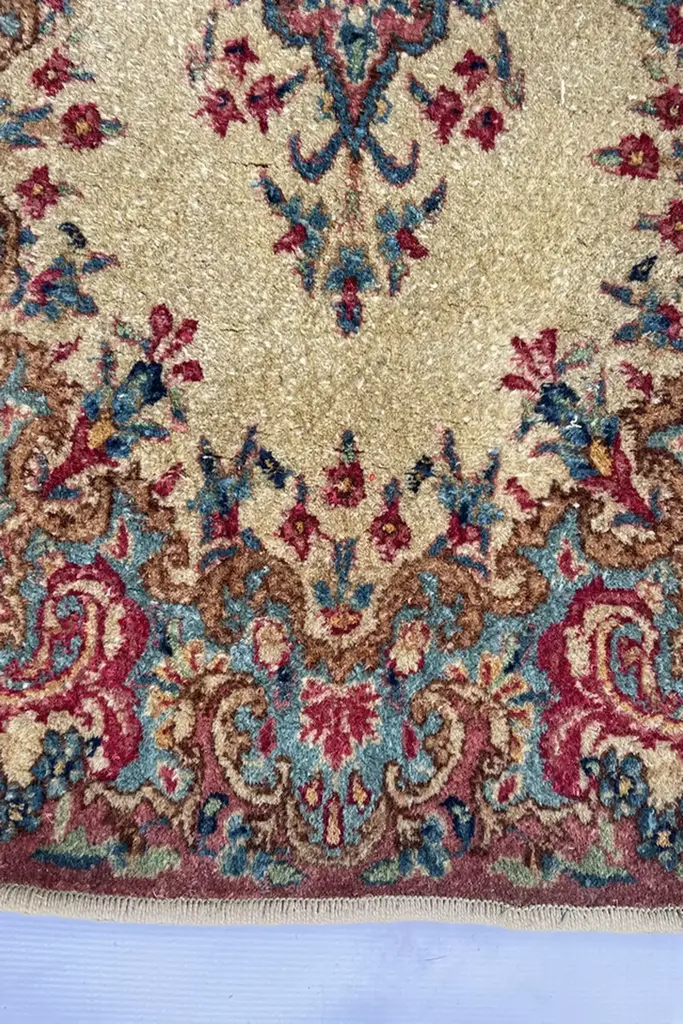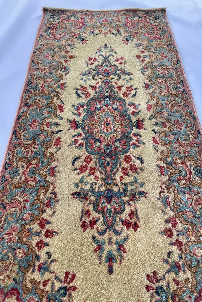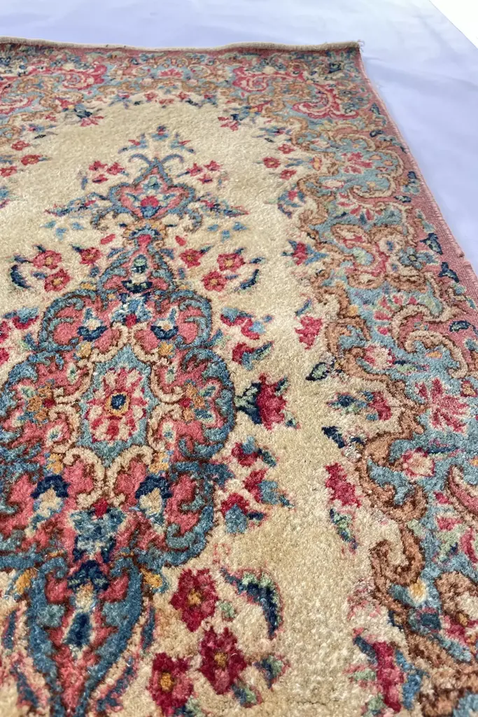 From the 1940s, this is a tightly woven piece from the southwestern part of Persia and it sits on an warm ivory ground. It features a non-traditional border style that they call "a broken border" with an open field that offers spaciousness in design. The floral art featured has pops of rose pink, dusty light pink and French blue. It's just pure LOVE!Add this to any space like the laundry room or a side entry or wherever you are in need to decorate with love and touch of history. Low pile and woven with all natural, vegetable dyed wool. Clean and in good shape with beautiful, happy color ways. * Vacuum regularly except over fringe. * A custom cut rug pad will be sent on the house.* Spot clean with a dash of mild soap and scrub using a warm, damp hand towel.* Contact us or an antique rug professional for major cleaning.* Imported.#### *Dimensions** 2 x 4