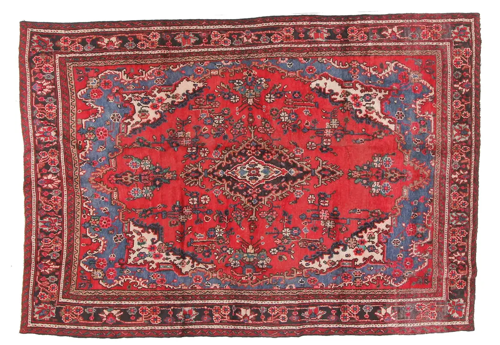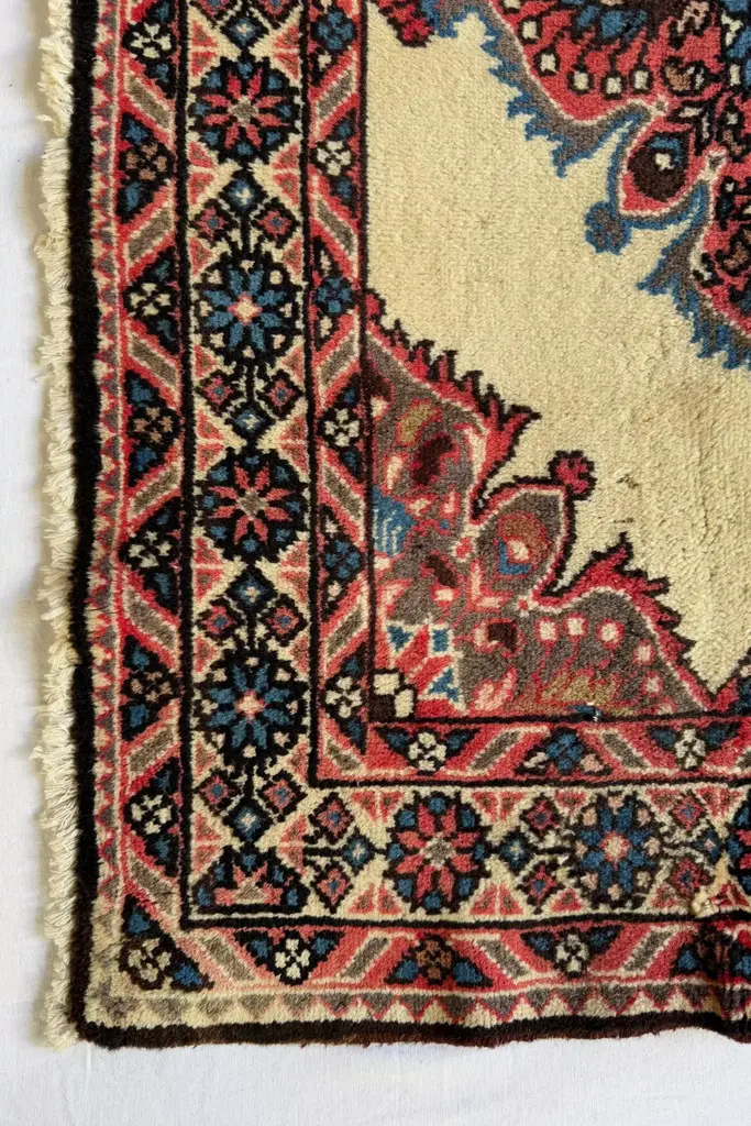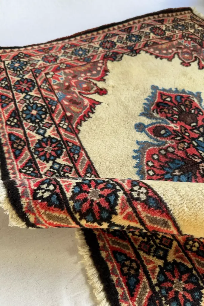 Introducing a stunning mid-century vintage Persian Hamadan rug, showcasing the intricate Kerman design. The ivory ground provides the perfect canvas for the prominent central medallion, which was designed in a way that is not often seen. The horizontally styled pattern adds a unique touch that will make a statement in any space and you can style it any which way you'd like.The main border band of this amazing rug is decorated with eight-pointed stars, which symbolizes happiness and fertility, that adds a touch of whimsy and charm to its overall look. The lovely color ways of this beauty feature a harmonious blend of warm and cool tones that complement each other perfectly.* Maintain with occasional vacuuming as neededsteer clear of the fringe. * A custom cut rug pad will be sent on the house.* Spot clean with a dash of mild soap and scrub using a warm, damp hand towel.* Contact us or an antique rug professional for a deep cleaning.* This is a unique, handmade antique rug with signs of age and history, showcasing the character and wear that come with time and use.* Imported.#### *Dimensions** 27 x 38