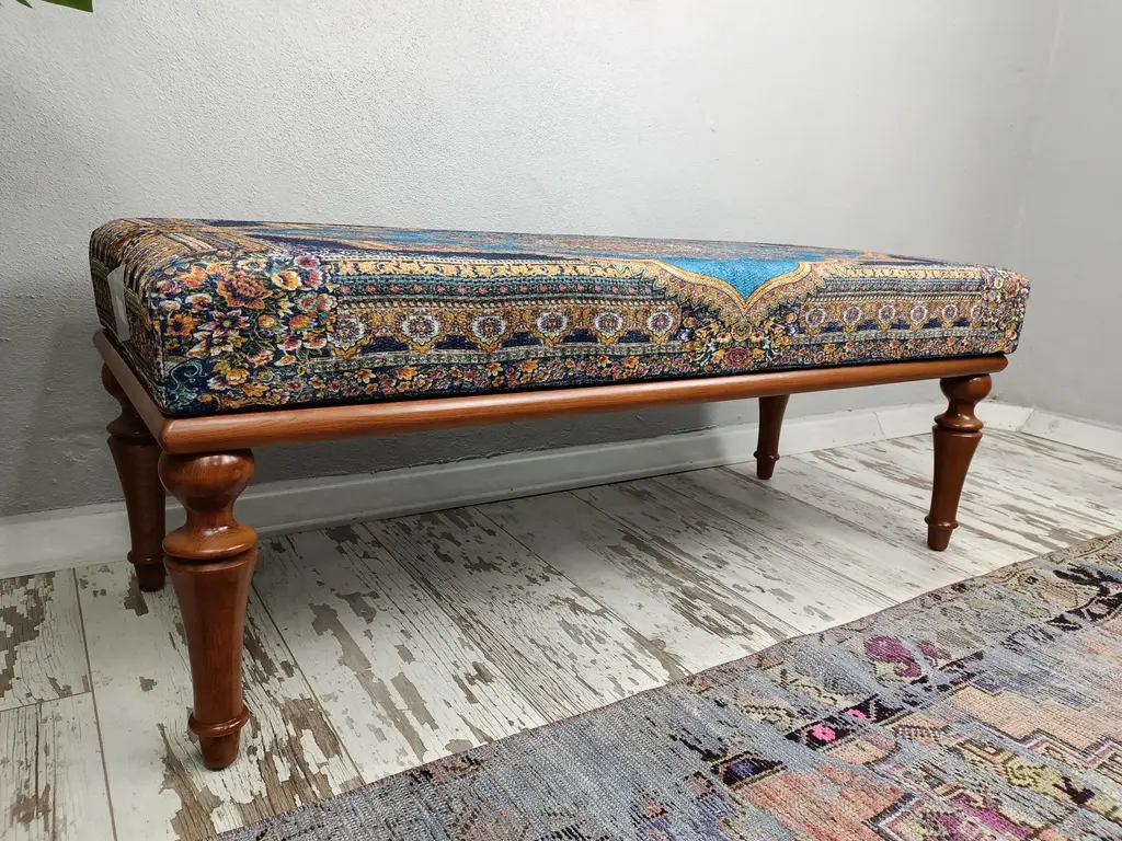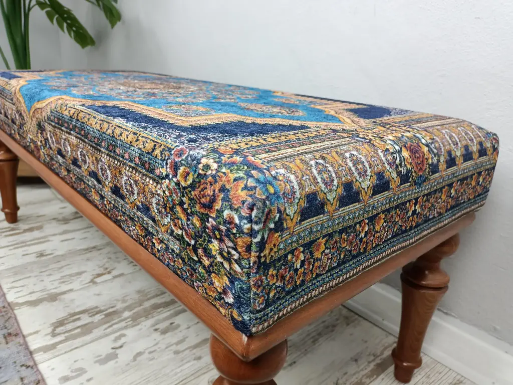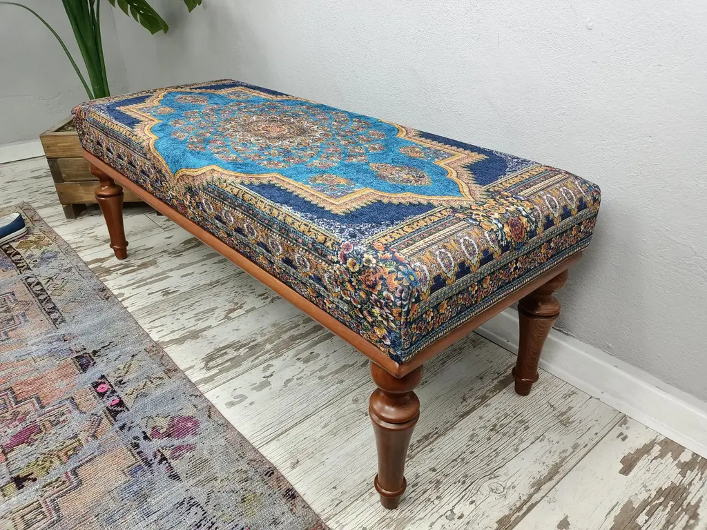 Details SIZE: 18X18X48 Inches ( with legs ) - 45x45x120 cm TYPE: Handmade Ottoman Bench CONDITION: is good. CONSTRUCT: It will come with disassemble legs, you can easily put together ottoman top table ( body ) with legs. There is disassembled legs with screw. Set up time around 30 seconds. Please use soft floor to set up. MATERIALS: fabric printed with rug pattern, Hornbeam Body, Textile and zipper backside, poplar wood inside CLEANING: Professionally Cleaned and Disinfected