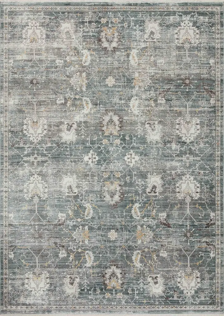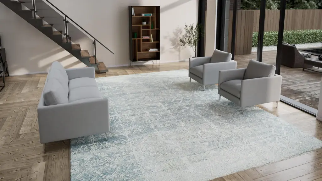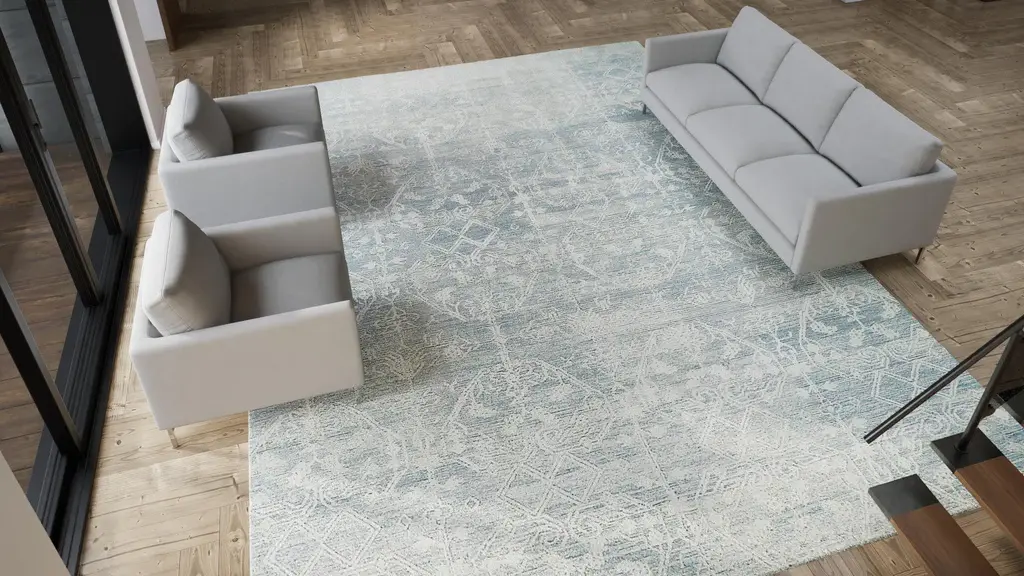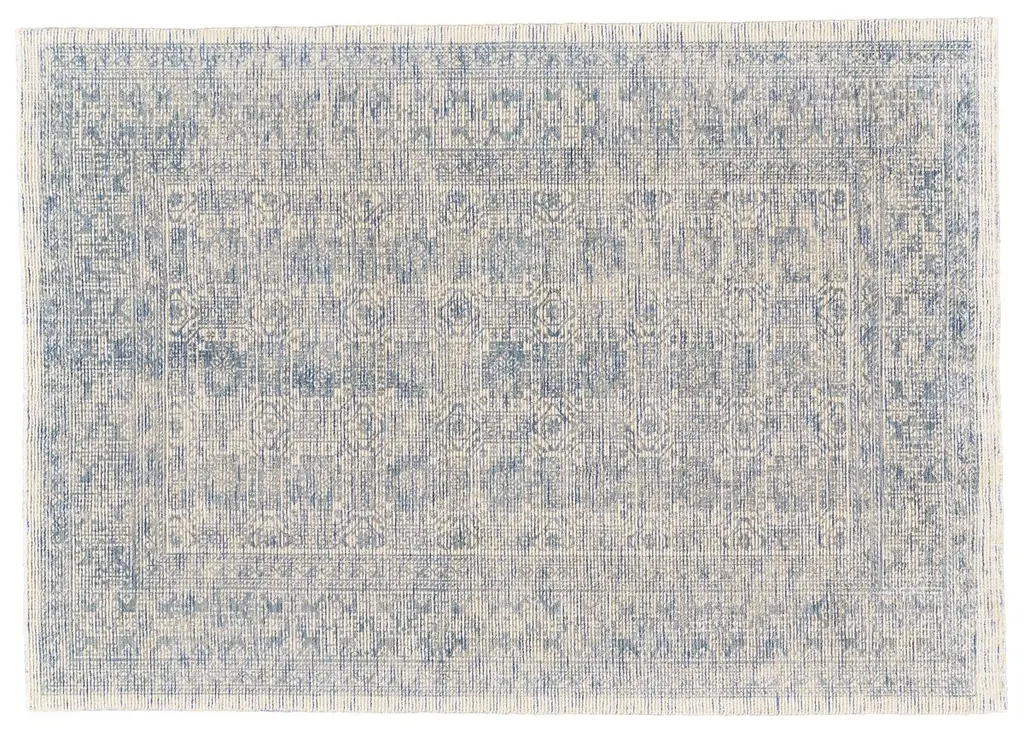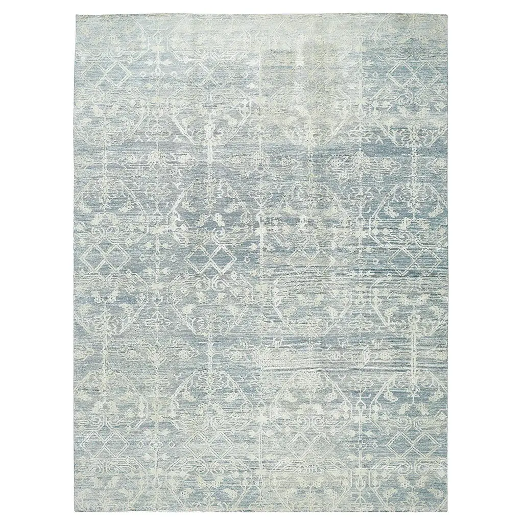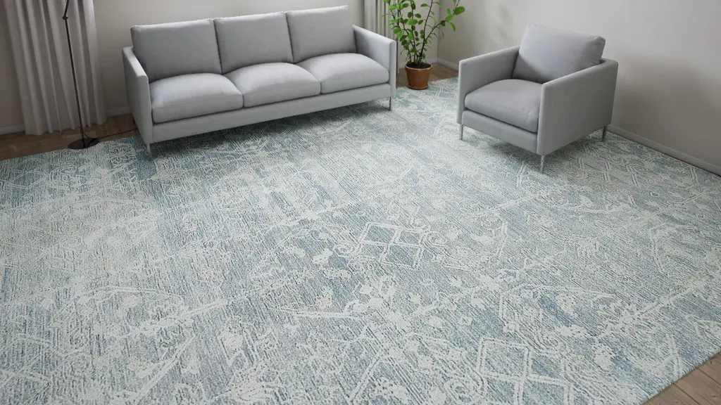 This Blue Traditional Wool Rug - 12' x 16' showcases a faded and distressed pattern that exudes a vintage charm. With blends of gray and blue shades, the intricate and ornate design features symmetrical motifs including geometric shapes and floral elements. Hand-knotted out of high-quality wool, this traditional rug from Nepal adds an elegant, classical touch to any room while maintaining a modern aesthetic. Expertly crafted, this rug boasts exceptional texture and timeless beauty.