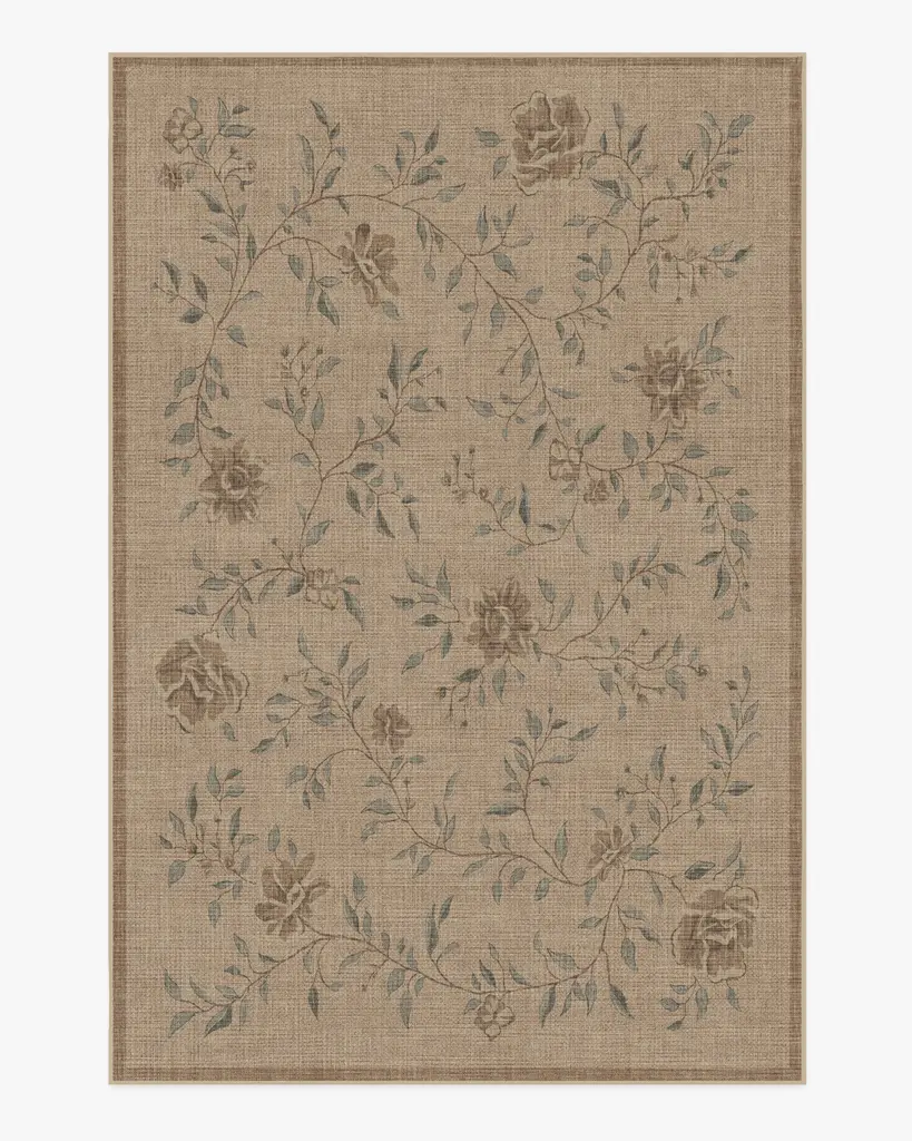 Soften up your space with this delicate floral design. Our Blume Natural Sage Re-Jute Rug features a vintage-inspired design of flowers with leaves and vines in muted shades of sage green and taupe on a jute-colored background. The woven jute-like material is made from recycled and virgin polyester, and polyurethane that won't shed or fray. Water-resistant, stain-resistant, and machine-washable.