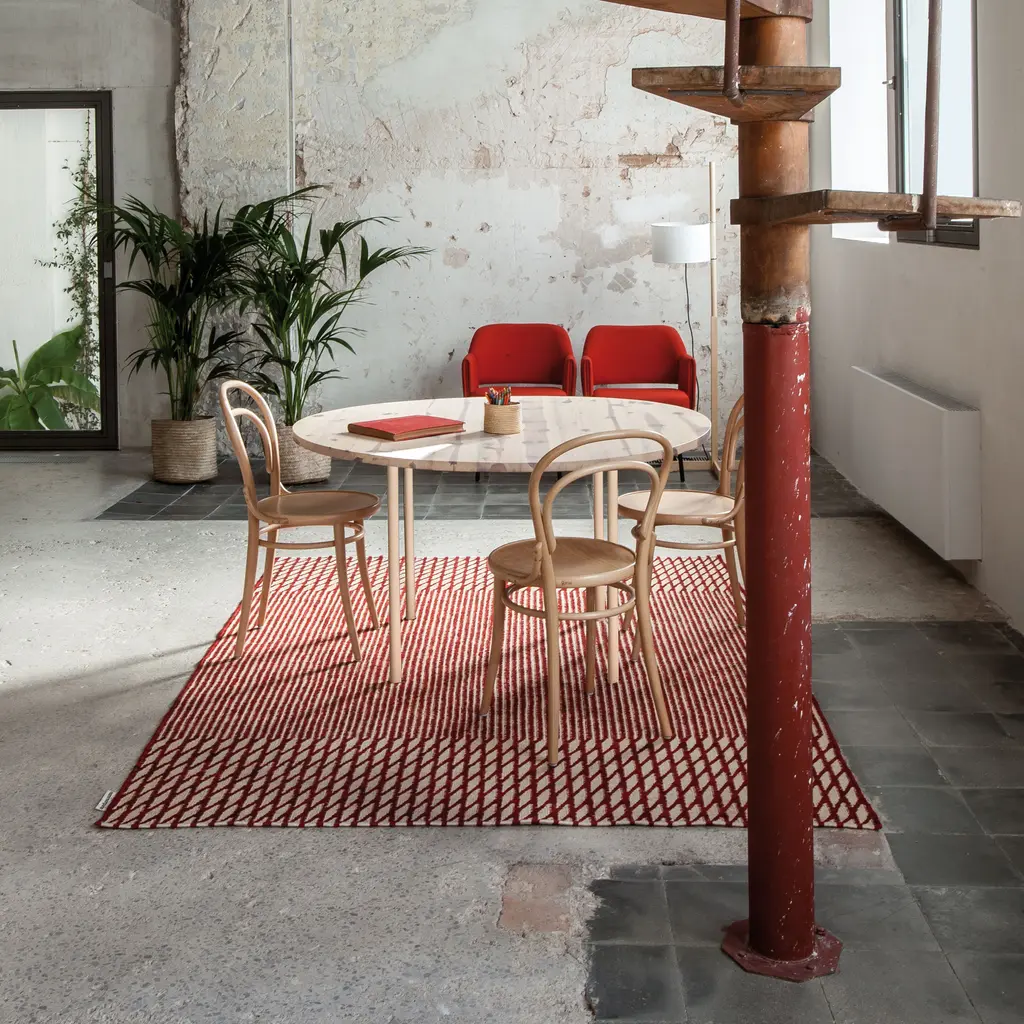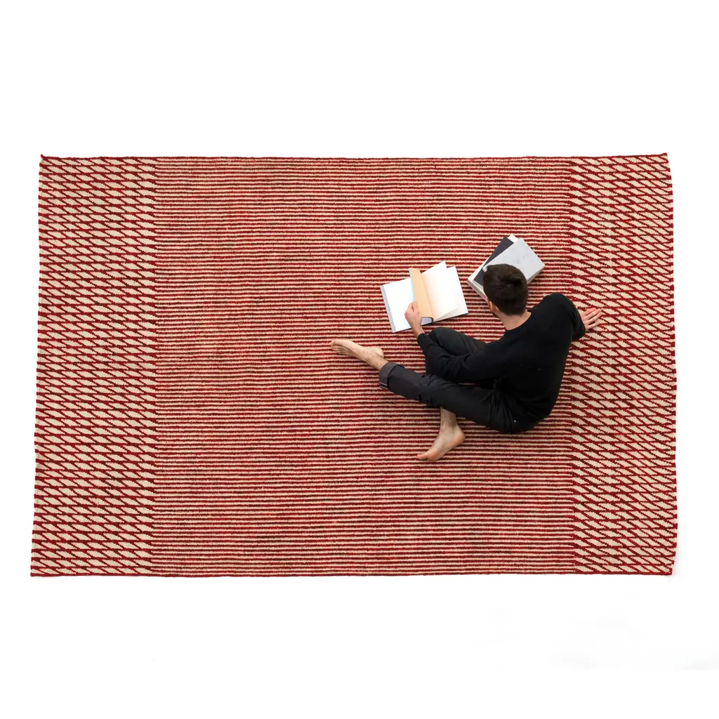 The sequence of geometric shapes and repetition are definitive hallmarks of the Bouroullec brothers. Their mastery, meticulousness, and tireless ability to always go a step further, has led them to work on Blur, a collection that offers two different readings. When viewing the rug from afar, an indefinite, unfocused surface is apparent, that gives its name to the collection. Nevertheless, upon approaching the rug, lines and rhythmic rhombuses in different proportions are revealed, in the purest kinetic style. This blurred effect has been achieved by inverting the sense in which the kilims are traditionally woven, which makes the process much more laborious. This change in weaving causes the lines to be blurred, mixing two colours unevenly, creating an aged rug, reminiscent of the past.
