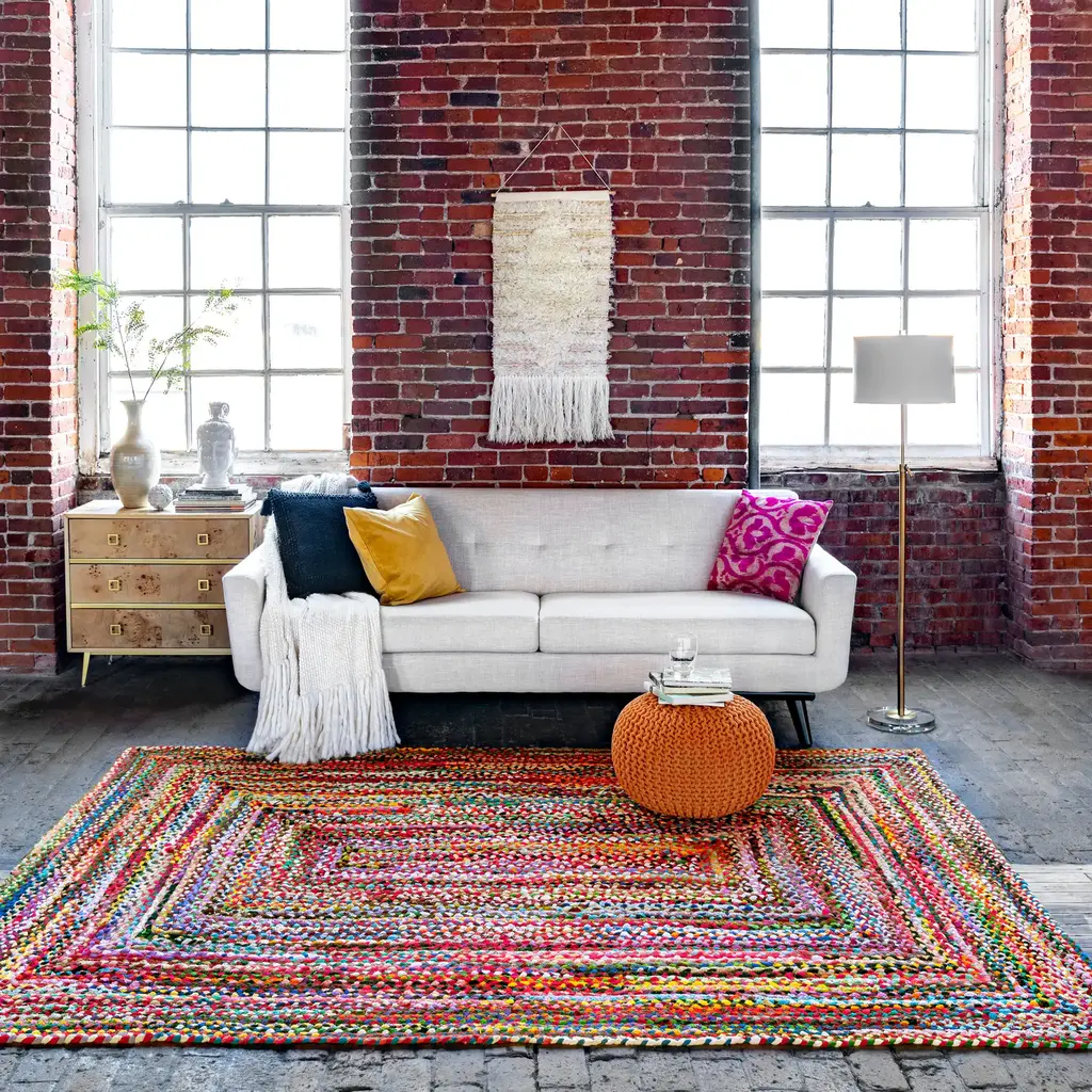 Brighten your home with this unique showstopping Chindi area rug. Crafted in India of carefully sourced natural fibers, each piece carries with it a variation of color and unique patterns, resulting in one of a kind rugs. Each rug is handmade and crafted by talented and devoted women who create with complete precision and exactness. This durable and stunning rug is perfect for your living room, dining room, kitchen, or hallway. Elevate your space today and enjoy your time at home with our pet-friendly and easy to clean area rugs.