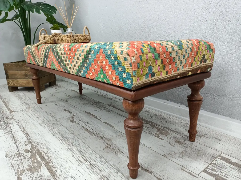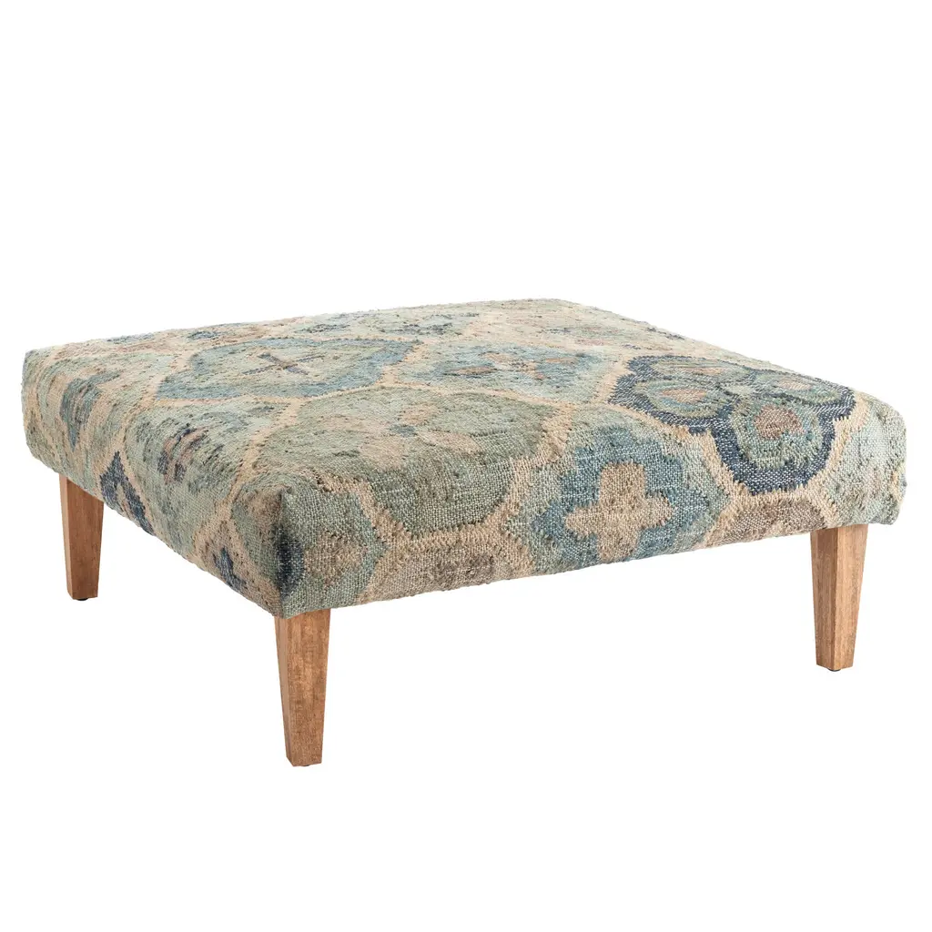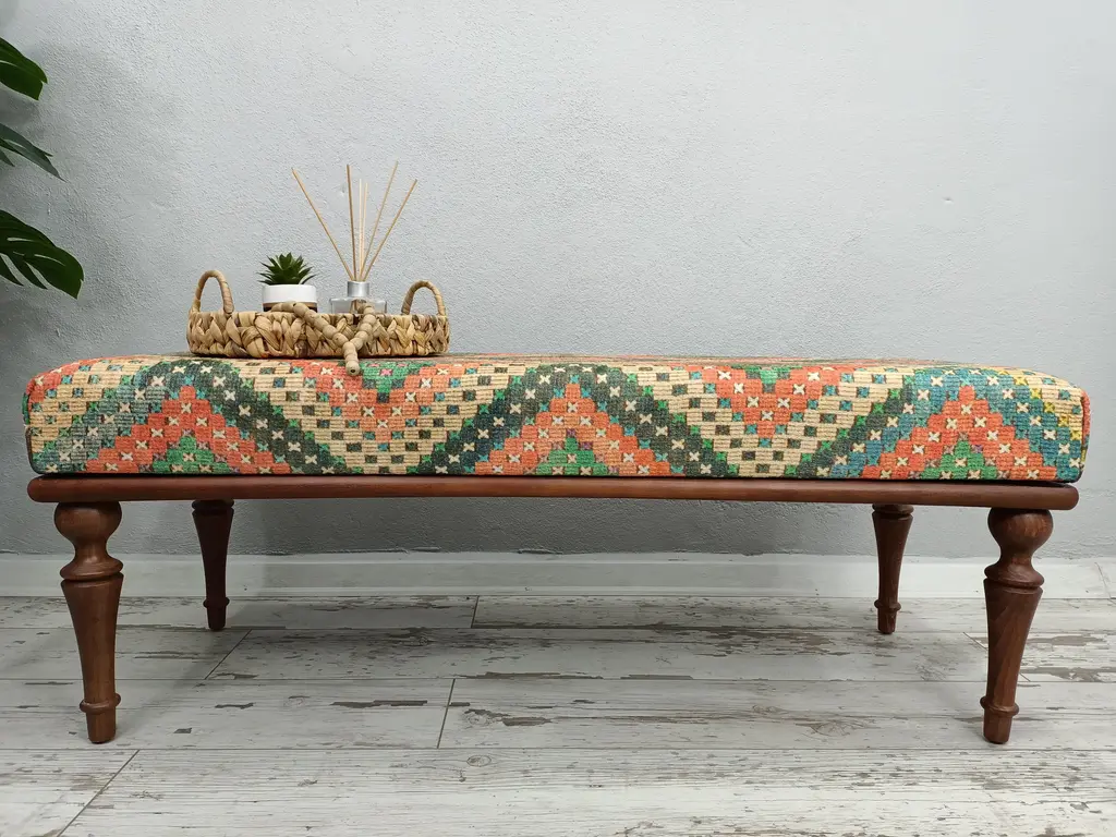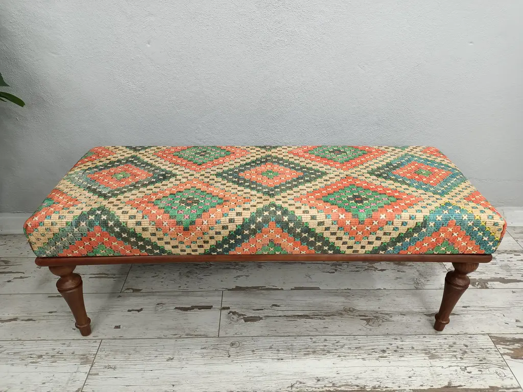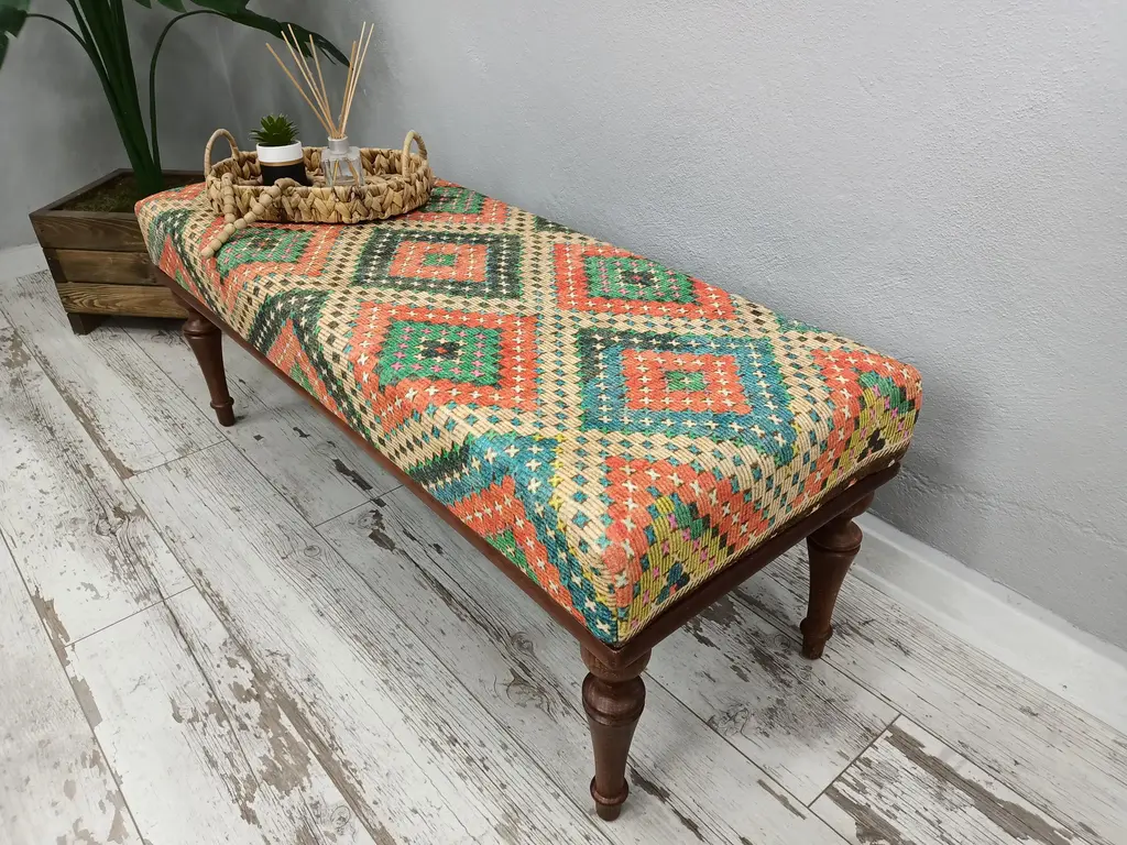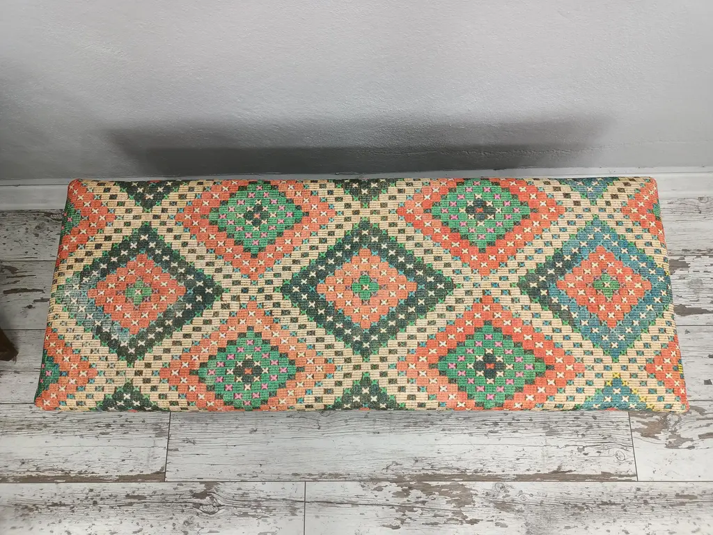 Details SIZE: 18X18X48 Inches ( with legs ) - 45x45x120 cm TYPE: Handmade Ottoman Bench CONDITION: is good. CONSTRUCT: It will come with disassemble legs, you can easily put together ottoman top table ( body ) with legs. There is disassembled legs with screw. Set up time around 30 seconds. Please use soft floor to set up. MATERIALS: fabric printed with rug pattern, Hornbeam Body, Textile and zipper backside, poplar wood inside CLEANING: Professionally Cleaned and Disinfected