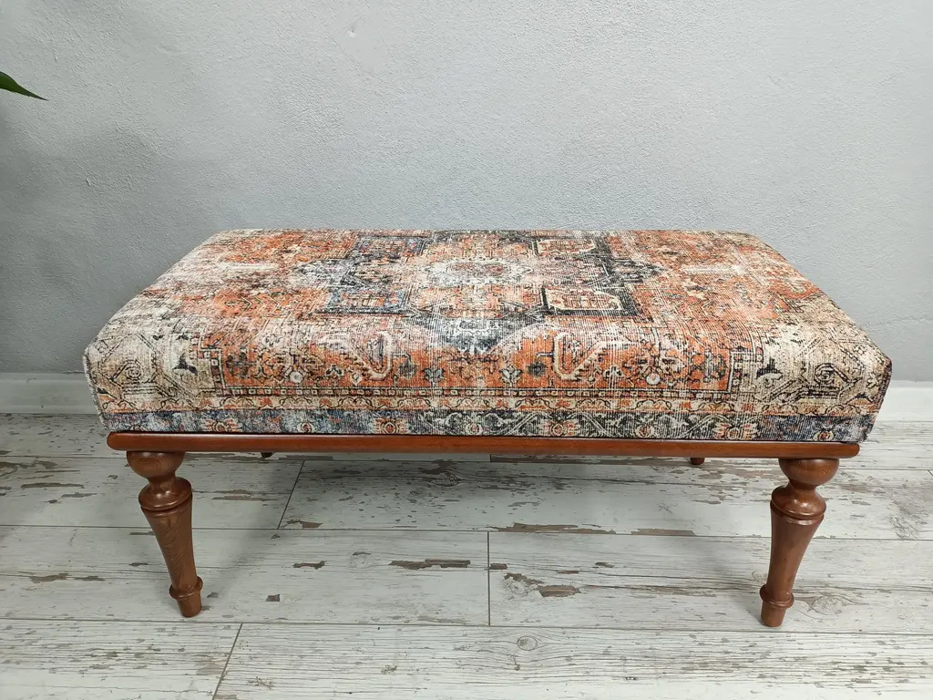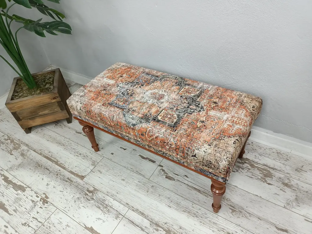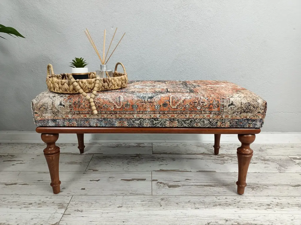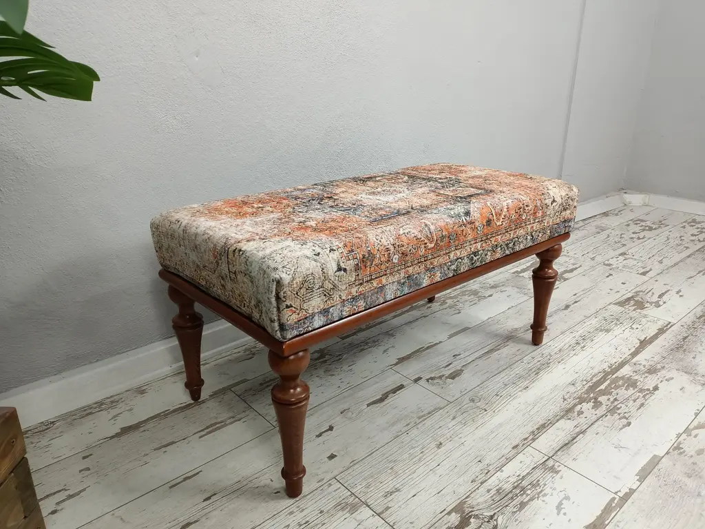 Details SIZE: 18X18X36 Inches ( with legs ) - 45x45x90 cm TYPE: Handmade Ottoman Bench CONDITION: is good. CONSTRUCT: It will come with disassemble legs, you can easily put together ottoman top table ( body ) with legs. There is disassembled legs with screw. Set up time around 30 seconds. Please use soft floor to set up. MATERIALS: Printed Rug, Hornbeam Body, Textile and zipper backside, poplar wood inside CLEANING: Professionally Cleaned and Disinfected