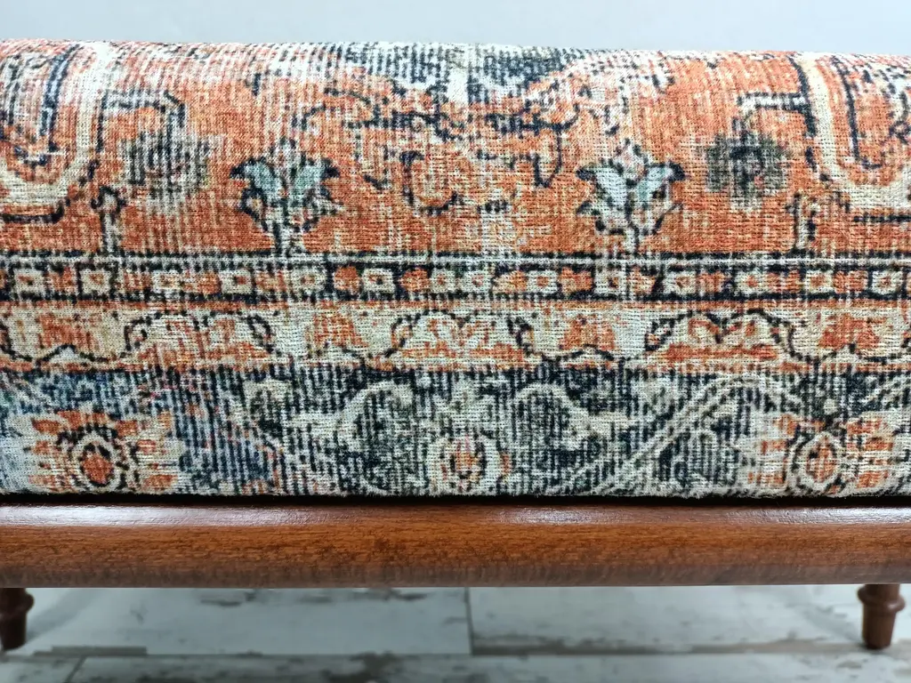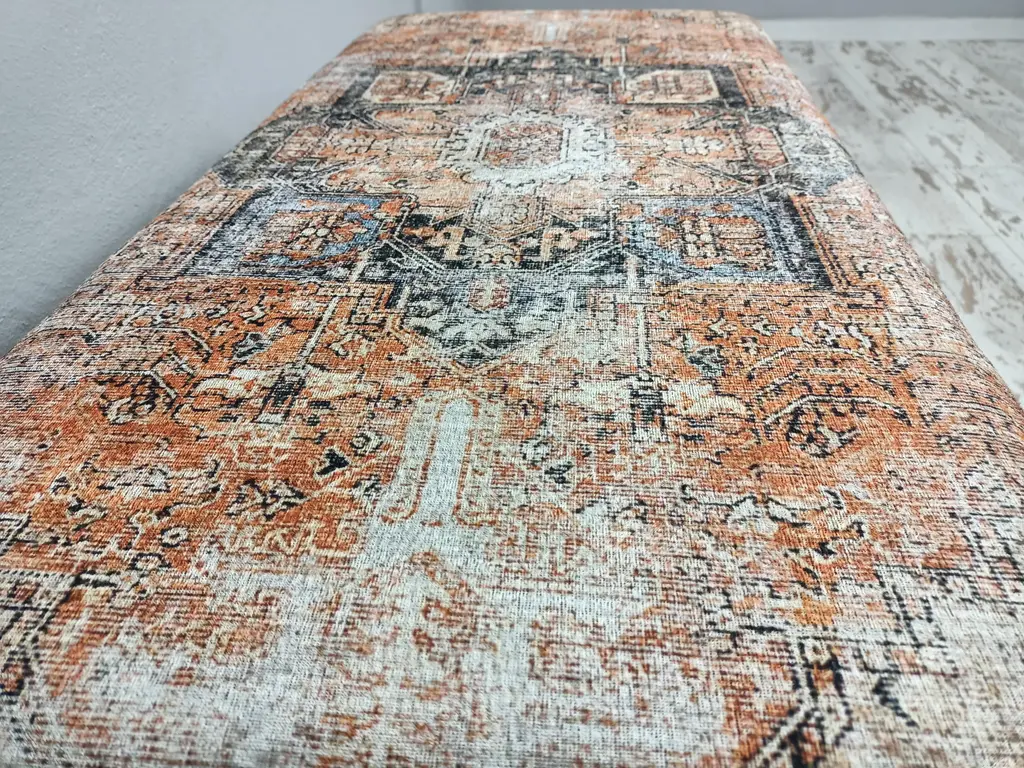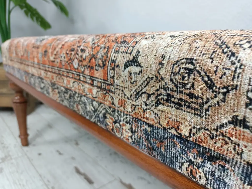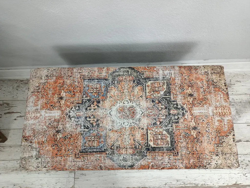 Details SIZE: 18X18X36 Inches ( with legs ) - 45x45x90 cm TYPE: Handmade Ottoman Bench CONDITION: is good. CONSTRUCT: It will come with disassemble legs, you can easily put together ottoman top table ( body ) with legs. There is disassembled legs with screw. Set up time around 30 seconds. Please use soft floor to set up. MATERIALS: Printed Rug, Hornbeam Body, Textile and zipper backside, poplar wood inside CLEANING: Professionally Cleaned and Disinfected