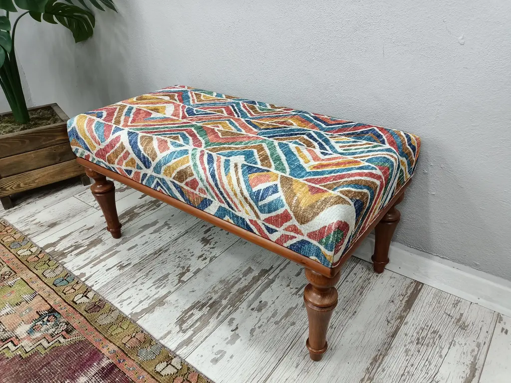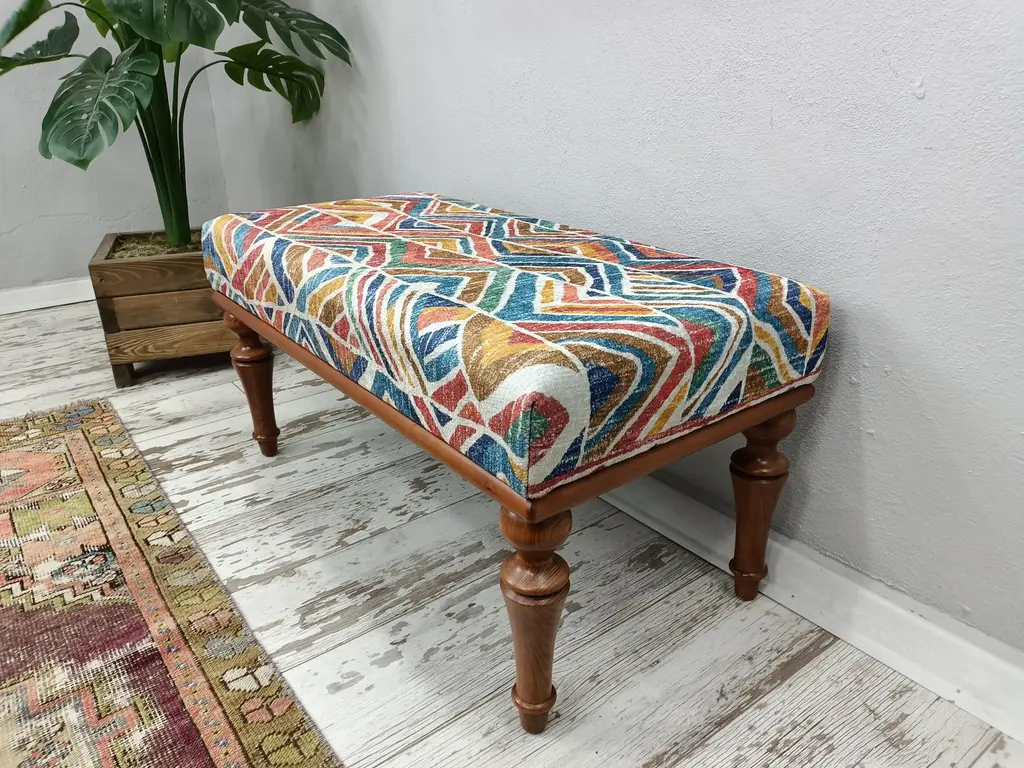 Details SIZE: 18X18X36 Inches ( with legs ) - 45x45x90 cm TYPE: Handmade Ottoman Bench CONDITION: is good. CONSTRUCT: It will come with disassemble legs, you can easily put together ottoman top table ( body ) with legs. There is disassembled legs with screw. Set up time around 30 seconds. Please use soft floor to set up. MATERIALS: fabric printed with rug pattern, Hornbeam Body, Textile and zipper backside, poplar wood inside CLEANING: Professionally Cleaned and Disinfected l