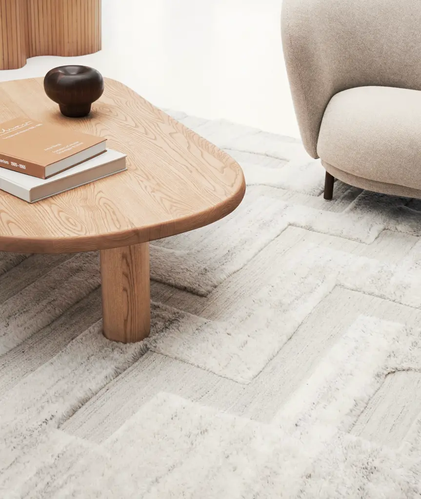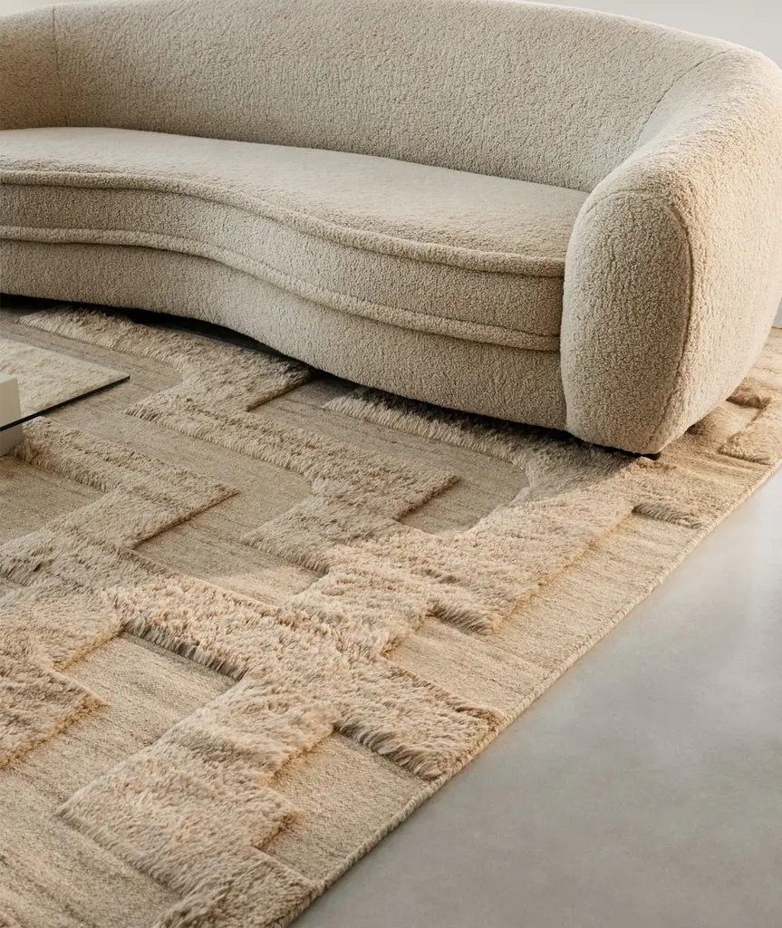 A bohemian minimalist design, where ancient textures meet modern lines. Textured to the eye, yet soft to touch. The geometric pattern is inspired by the limestone steps of the grand stairs to historic Stockholm buildings. With an all-natural, undied European wool, no color has been used to create the pattern. Instead contrast is achieved by combining a flat-woven canvas with a plush hand-knotted pile. Knot-by-knot the rugs are made slowly — the artisan way — making the minimalist design durable to last over time with a beautifully raw bohemian aesthetic.