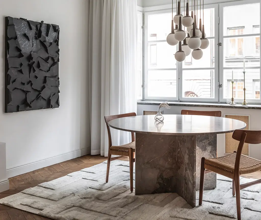 A bohemian minimalist design, where ancient textures meet modern lines. Textured to the eye, yet soft to touch. The geometric pattern is inspired by the limestone steps of the grand stairs to historic Stockholm buildings. With an all-natural, undied European wool, no color has been used to create the pattern. Instead contrast is achieved by combining a flat-woven canvas with a plush hand-knotted pile. Knot-by-knot the rugs are made slowly — the artisan way — making the minimalist design durable to last over time with a beautifully raw bohemian aesthetic.