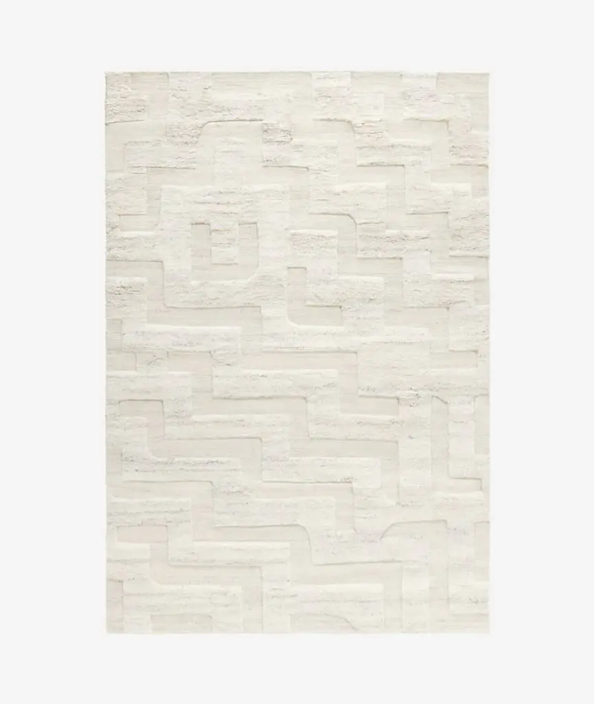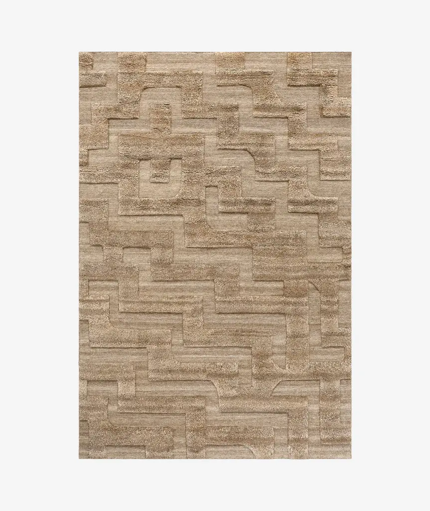A bohemian minimalist design, where ancient textures meet modern lines. Textured to the eye, yet soft to touch. The geometric pattern is inspired by the limestone steps of the grand stairs to historic Stockholm buildings. With an all-natural, undied European wool, no color has been used to create the pattern. Instead contrast is achieved by combining a flat-woven canvas with a plush hand-knotted pile. Knot-by-knot the rugs are made slowly — the artisan way — making the minimalist design durable to last over time with a beautifully raw bohemian aesthetic.