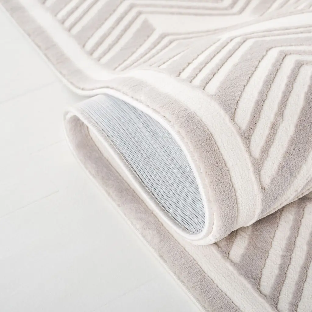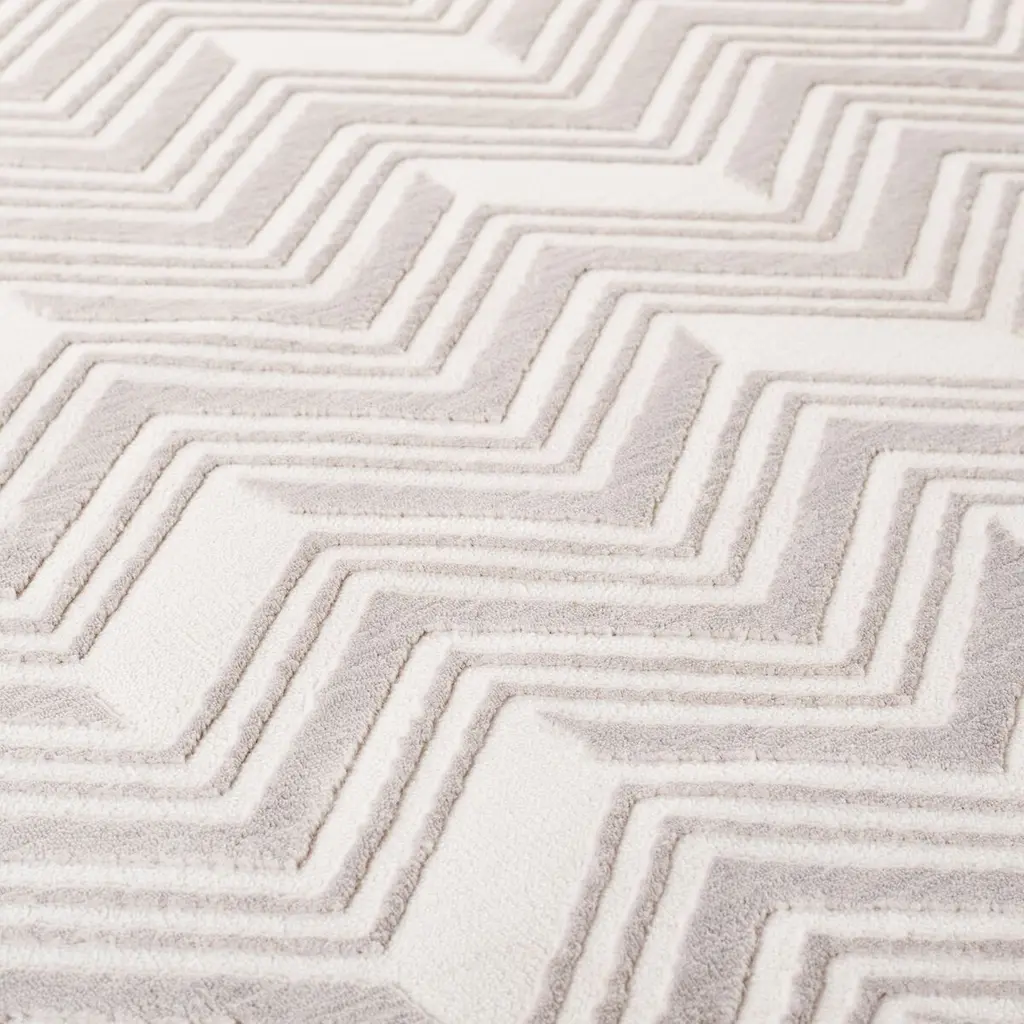 Elevate your living space with this exquisite 5' x 7' area rug, masterfully crafted in Turkey with high-quality, power-loomed polyester. Designed to bring a touch of modern elegance to any room, the rug features a chic ivory hue that exudes a warm, inviting aura. The medium rectangle shape and optimal 1/2" pile height offer the perfect balance of comfort and ease of maintenance. Highly durable and resilient, this rug is an ideal choice for high-traffic areas, retaining its beauty over time. Adorned with a striking chevron pattern, this area rug introduces a dynamic visual element that complements contemporary and minimalist decors. The subtle variations in tone produce an enchanting three-dimensional effect that adds depth and character to your flooring. Experience the perfect combination of style and functionality with this modern, Turkish-made polyester area rug, destined to become the centerpiece of your home's design.story.