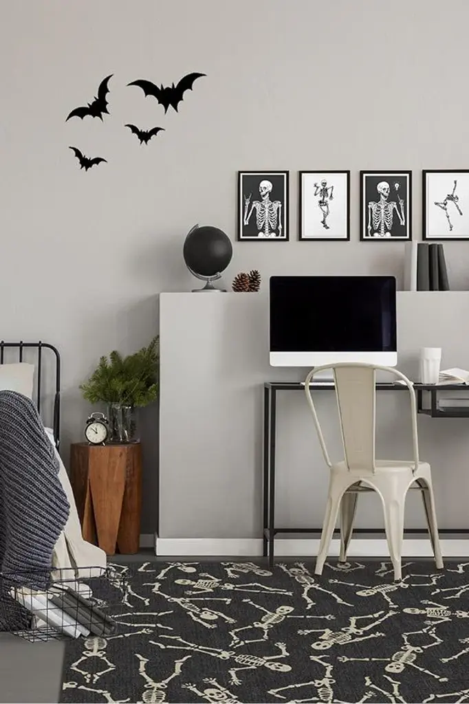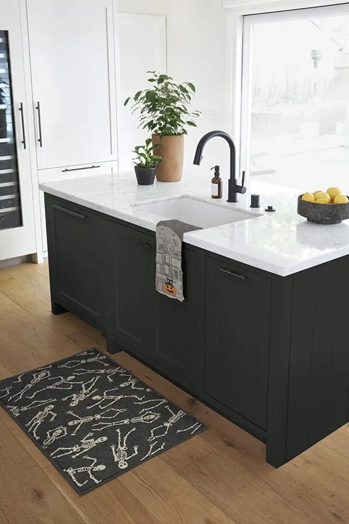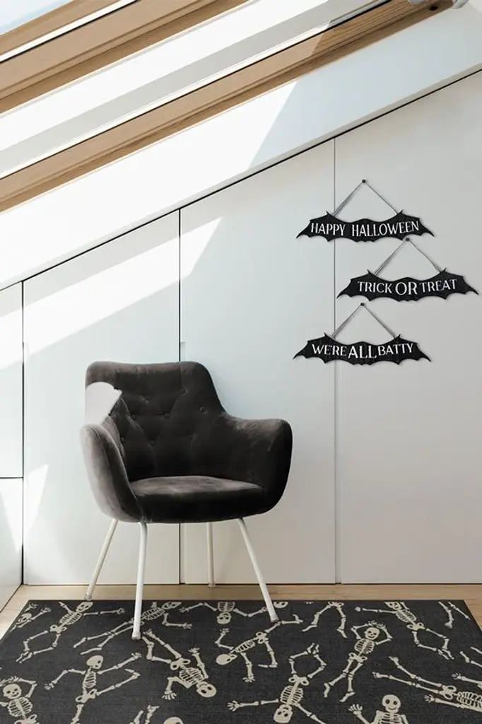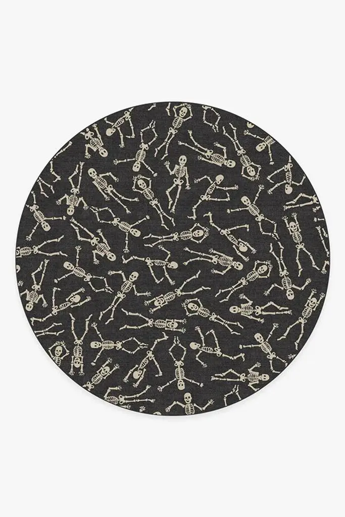 Our Bone Dance Black Rug is altogether haunting and whimsical. Dancing skeletons illustrated in neutral grey and white are scattered upon a background of black, creating a Halloween-themed rug to get your party or holiday decor jumping. Water-resistant, stain-resistant, and machine-washable.