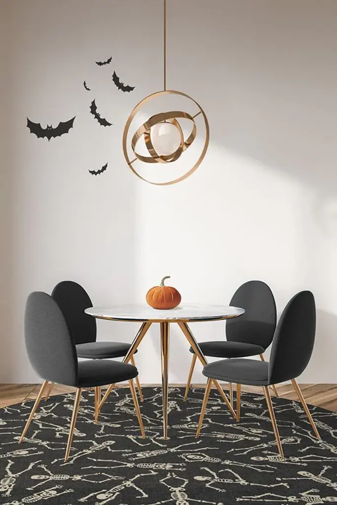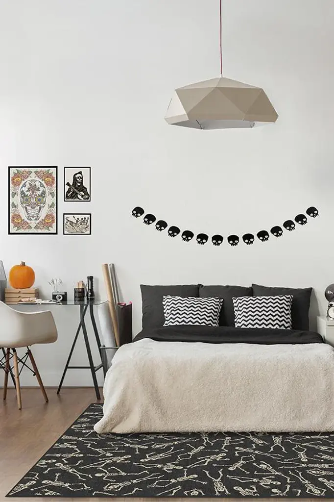 Our Bone Dance Black Rug is altogether haunting and whimsical. Dancing skeletons illustrated in neutral grey and white are scattered upon a background of black, creating a Halloween-themed rug to get your party or holiday decor jumping. Water-resistant, stain-resistant, and machine-washable.