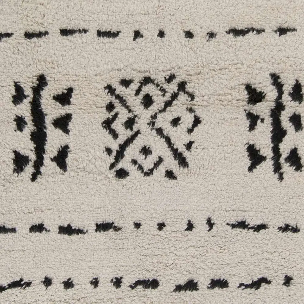 Collection: Boron Colors: Ivory, Black Construction: Hand Knotted Material: 100% NZ Wool Pile: Medium Pile Pile Height: 0.39" Styles: Bohemian/Global Made In: India Thickness: 0.51" Price Range: $$$$$ (Affordable)