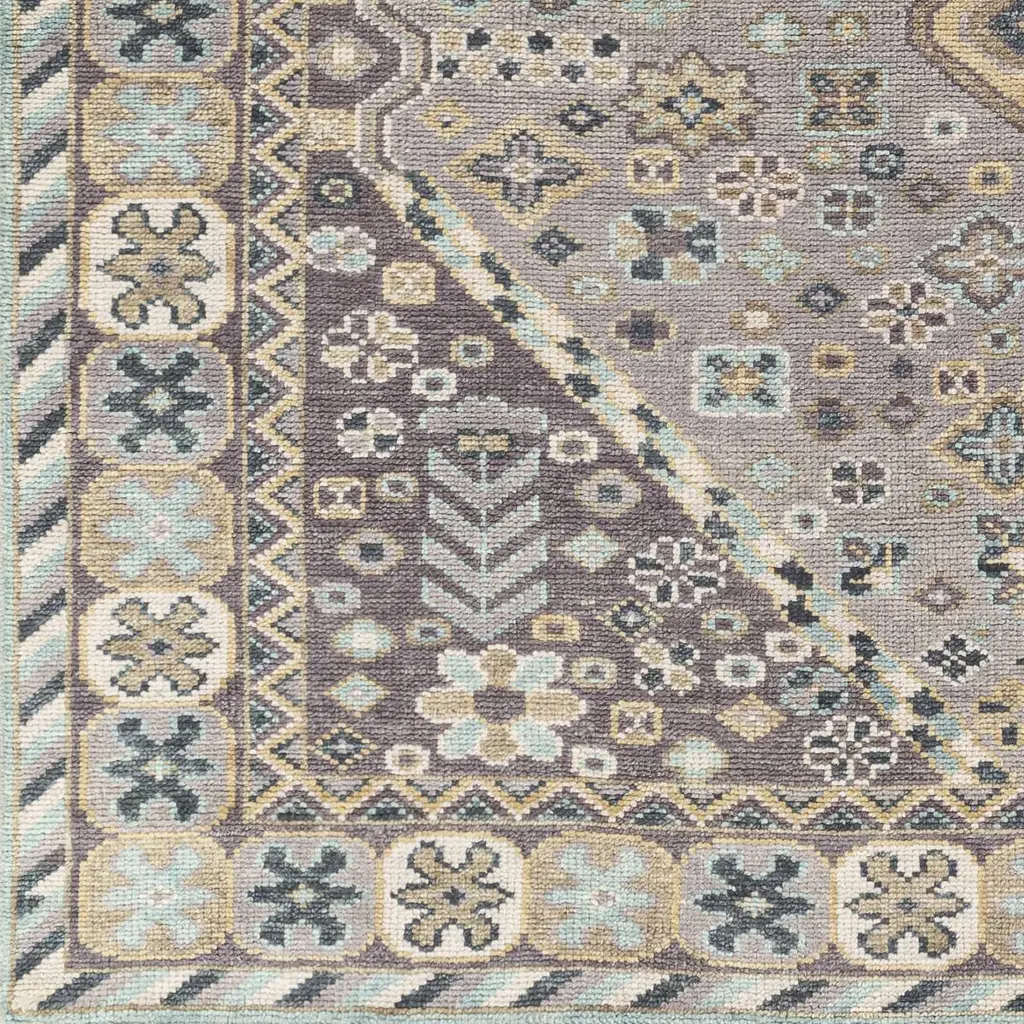 Collection: Boroon Colors: Black, Gray, Ice Blue, Tan, Navy, Peach Construction: Hand Knotted Material: 100% Wool Pile: Low Pile Pile Height: 0.11" Styles: Traditional Made In: India Thickness: 0.5" Fringe Length: 0.9" Price Range: $$$$$ (Premium)