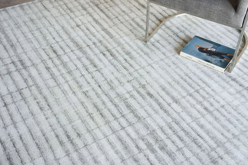 A dense textured loop pile, featuring a subtle overall design of random width color bands. The soft colors are chosen to complement the pattern, adding a luxurious and sophisticated touch to any space. The simplicity of the all-over pattern enhances its elegance, making it a perfect addition to your decor.