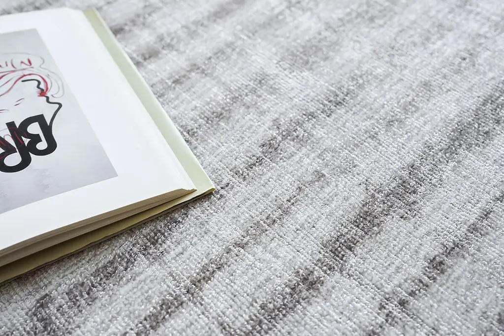 A dense textured loop pile, featuring a subtle overall design of random width color bands. The soft colors are chosen to complement the pattern, adding a luxurious and sophisticated touch to any space. The simplicity of the all-over pattern enhances its elegance, making it a perfect addition to your decor.