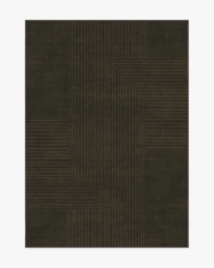 Washable vibes only. Our Bowie Charcoal Rug gives rich, black lines a sophisticated edge as they fold over and under one another, creating a masculine retro energy. Water-resistant, stain-resistant, and machine-washable. Rug colors may vary slightly according to your device and the lighting in your space.