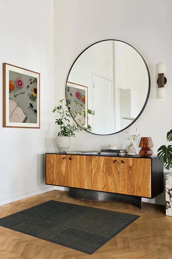 Washable vibes only. Our Bowie Charcoal Rug gives rich, black lines a sophisticated edge as they fold over and under one another, creating a masculine retro energy. Water-resistant, stain-resistant, and machine-washable. Rug colors may vary slightly according to your device and the lighting in your space.
