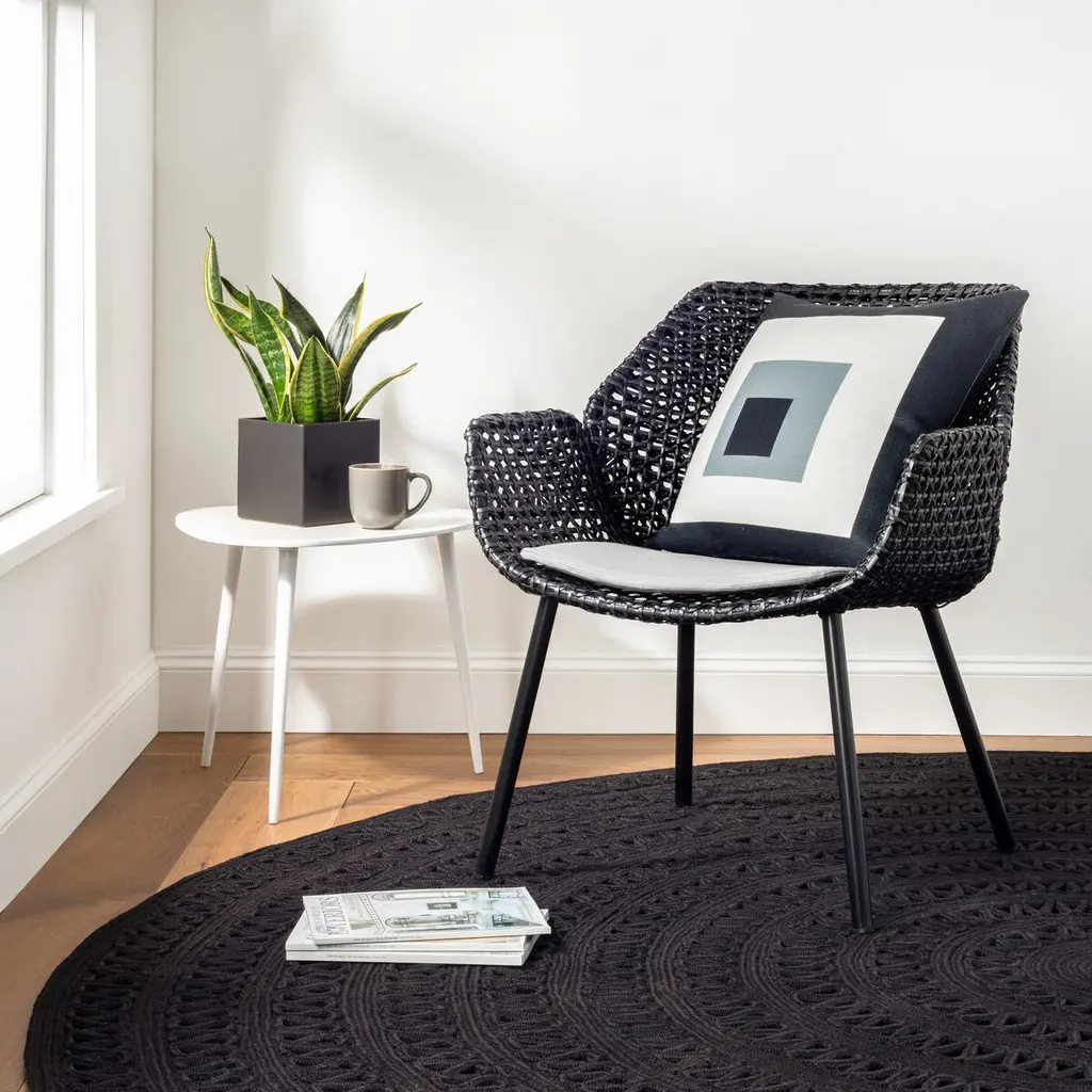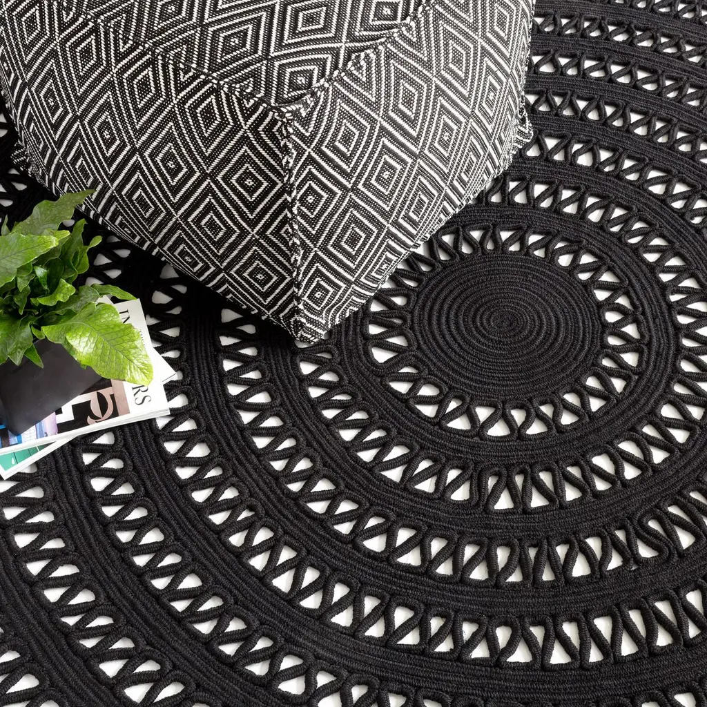 Handcrafted of performance fiber made from recycled plastic bottles, this filigree rug will bring long-lasting boho chic to a porch, a patio, or just about any room in your home. It's been treated to resist fading from the sun, and it has latex backing to help prevent slipping.