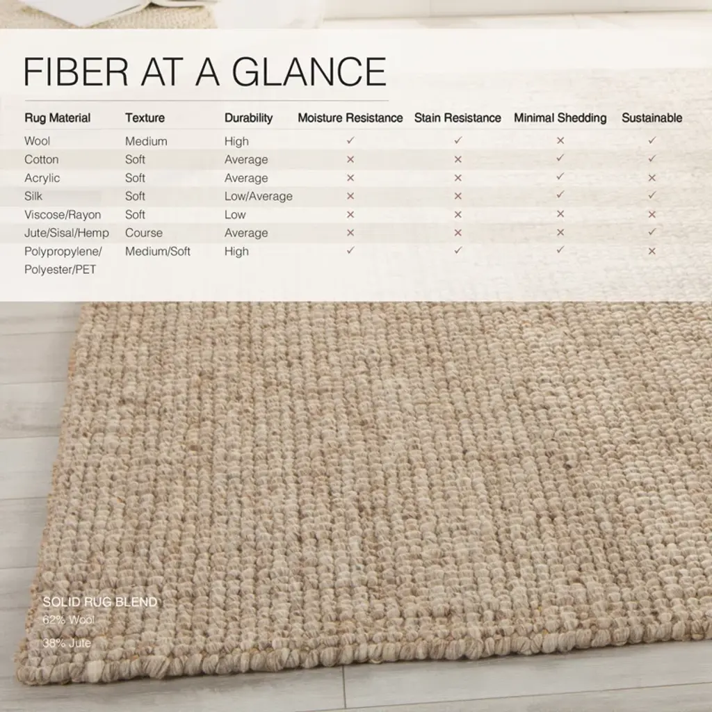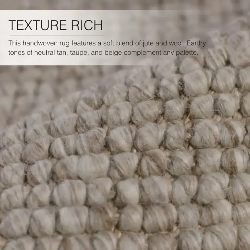 Ground your space. Crafted from a blend of soft wool + natural jute, this area rug’s earthy tone keeps the emphasis on its hand-woven texture. A medium pile height delivers the right mix of cushion and durability. We suggest adding a rug pad to hold it in place.