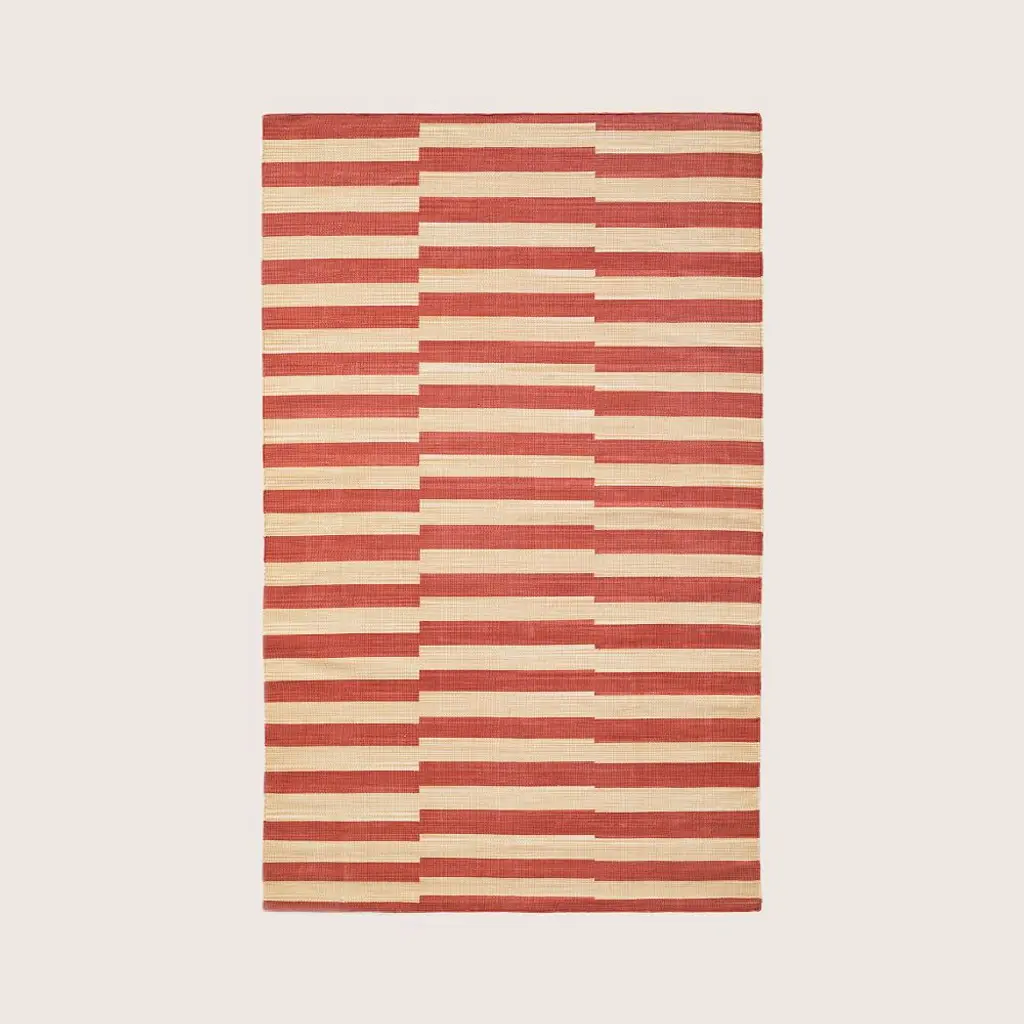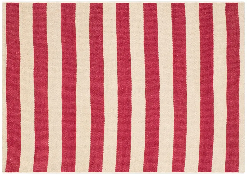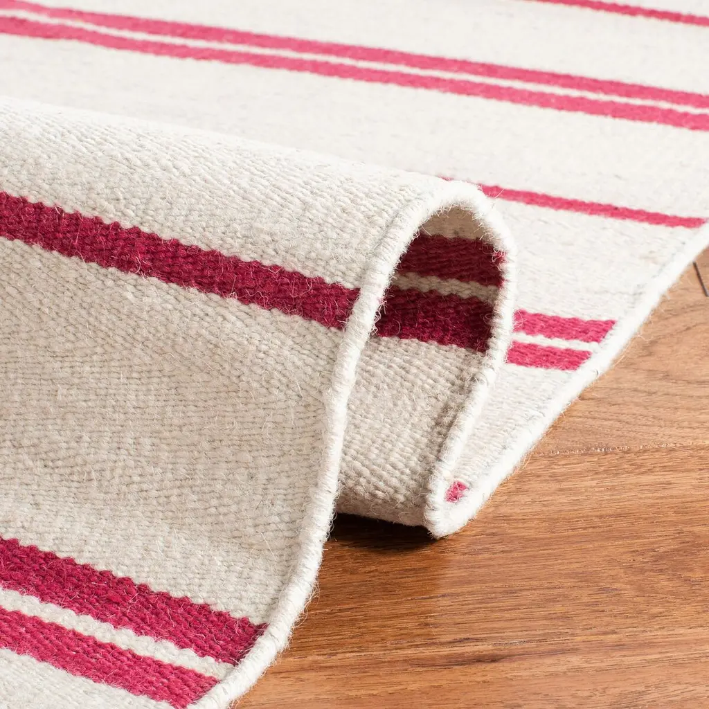 Introducing our exquisite hand woven accent rug, a celebration of craftsmanship and design. This 2' X 3' floor covering is a seamless blend of comfort and style, meticulously crafted in India from 100% wool pile to ensure a soft, luxurious feel underfoot. The rug boasts a low profile with a pile height of 1/8", making it a perfect addition to any room without obstructing doorways or entrances. The rich rouge hues are elegantly arranged in a timeless pattern that features bold horizontal stripes, adding a splash of color and visual interest to your space. The simplicity of the design ensures that the rug can stand alone as a focal point or complement your existing decor with its versatile aesthetic. Ideal for bringing warmth and texture to small spaces, this rug is not just a statement piece but also a testament to the enduring art of hand woven textiles. Whether you're looking to enhance your living room, bedroom, or entryway, this area rug promises to deliver both sophistication and durability for years to come. Embrace the allure of this artisan-crafted rug and transform your home into a haven of style and comfort.