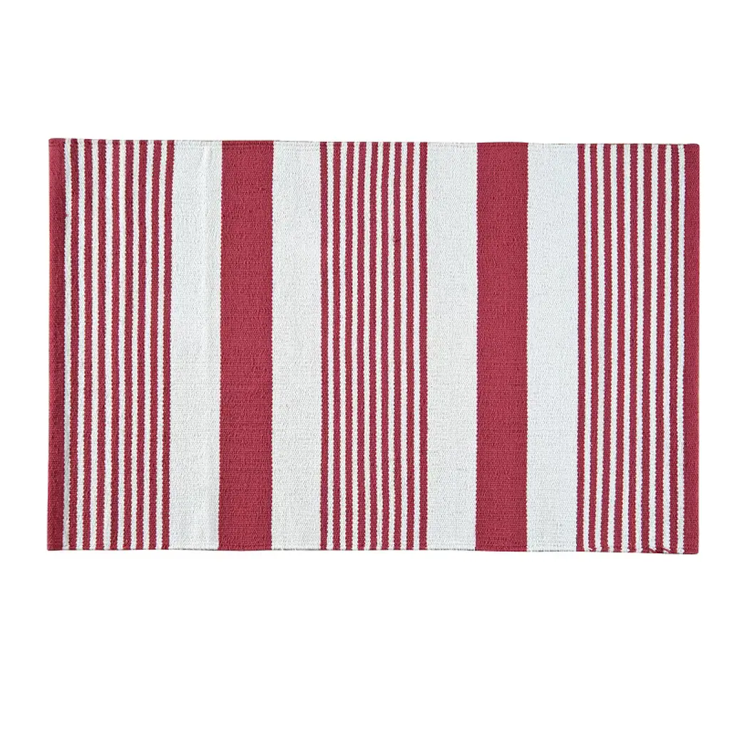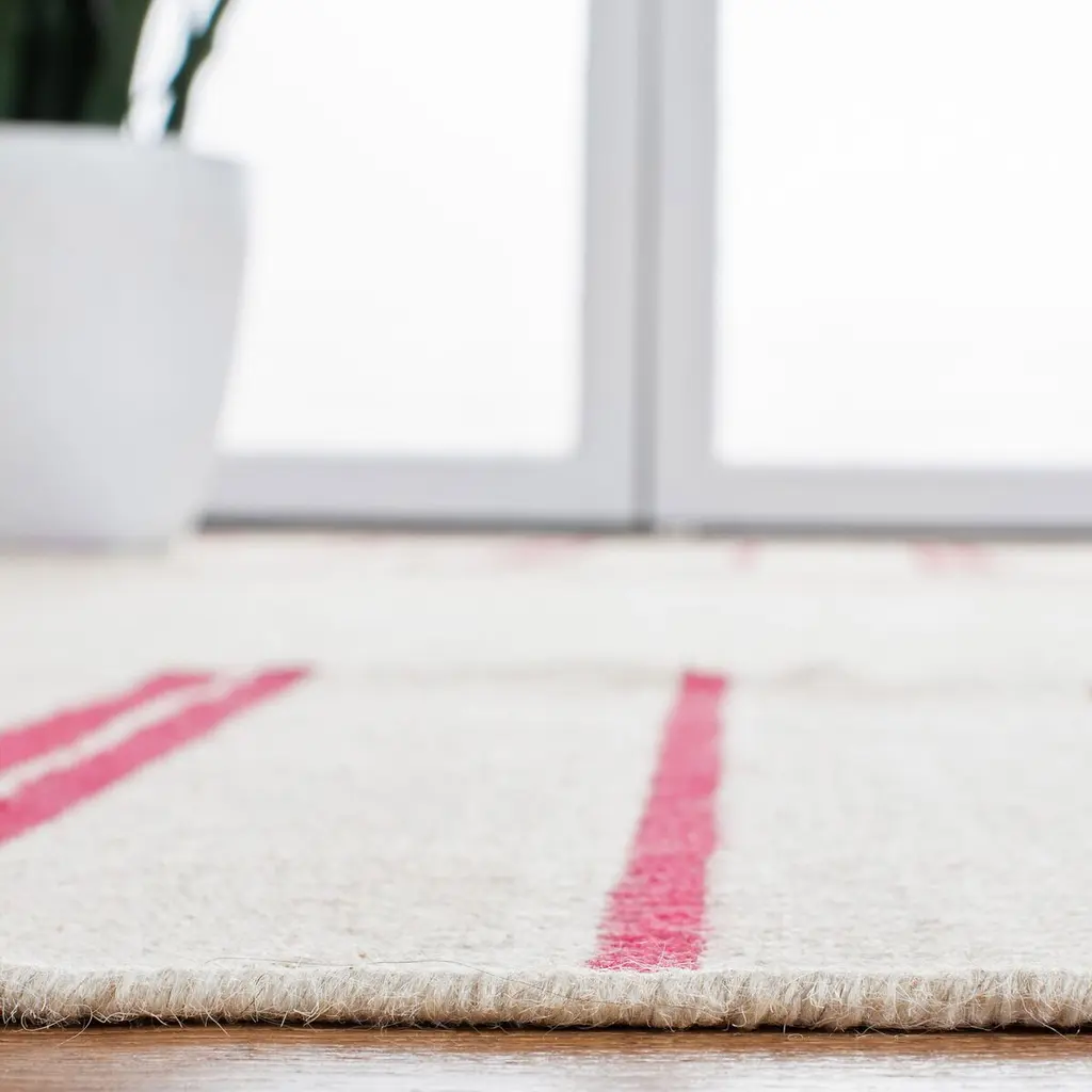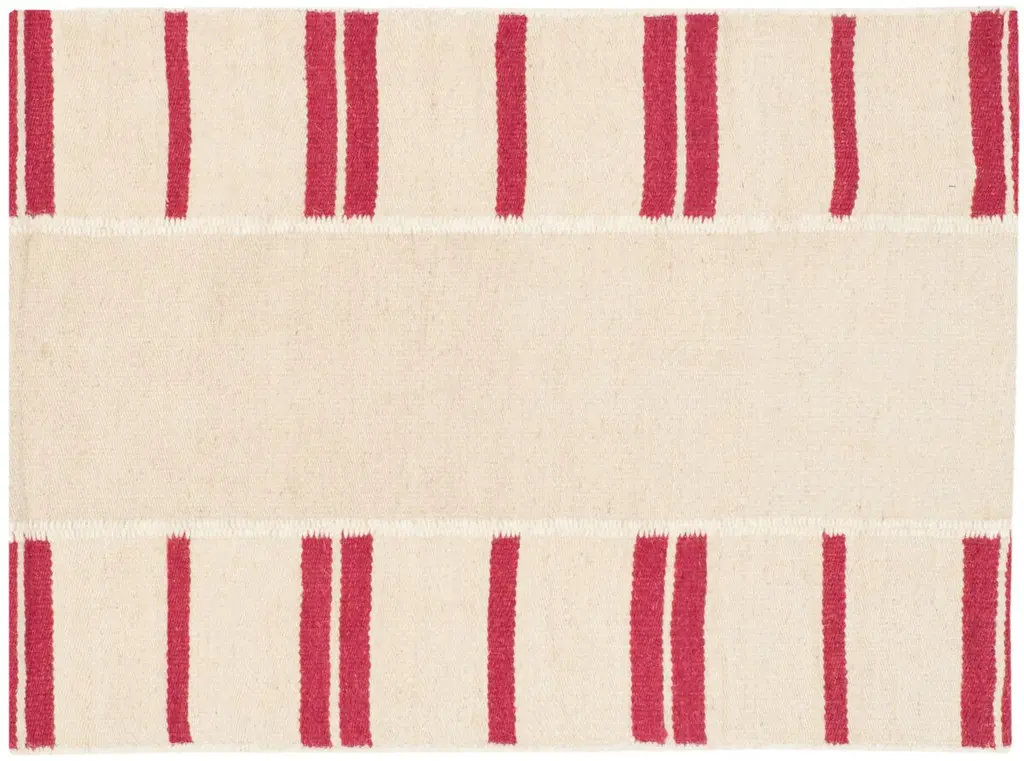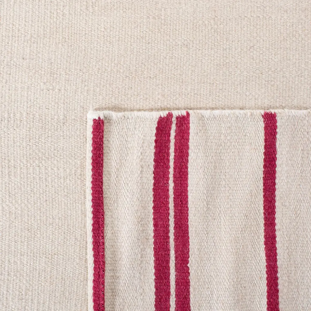 Introducing our exquisite hand woven accent rug, a celebration of craftsmanship and design. This 2' X 3' floor covering is a seamless blend of comfort and style, meticulously crafted in India from 100% wool pile to ensure a soft, luxurious feel underfoot. The rug boasts a low profile with a pile height of 1/8", making it a perfect addition to any room without obstructing doorways or entrances. The rich rouge hues are elegantly arranged in a timeless pattern that features bold horizontal stripes, adding a splash of color and visual interest to your space. The simplicity of the design ensures that the rug can stand alone as a focal point or complement your existing decor with its versatile aesthetic. Ideal for bringing warmth and texture to small spaces, this rug is not just a statement piece but also a testament to the enduring art of hand woven textiles. Whether you're looking to enhance your living room, bedroom, or entryway, this area rug promises to deliver both sophistication and durability for years to come. Embrace the allure of this artisan-crafted rug and transform your home into a haven of style and comfort.