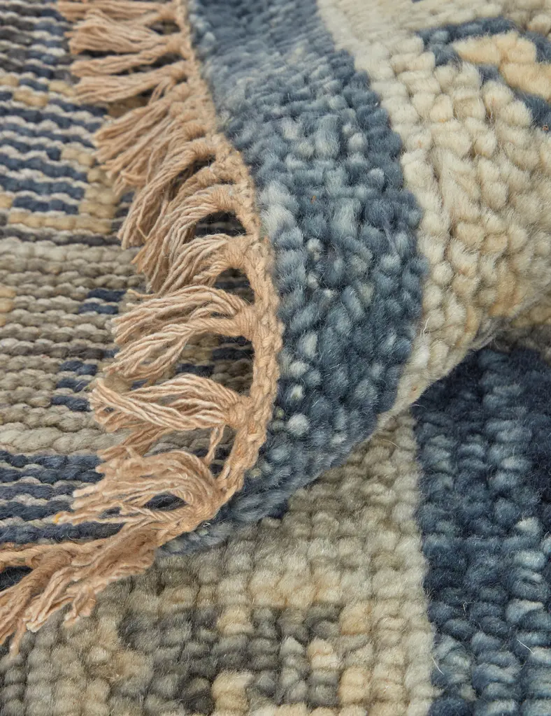 Timeless artistry meets bold tones in the Bridger rug. The ornate floral motifs stand out against the blue backdrop, bringing depth and texture to the room. This hand-knotted rug offers a soft yet durable tread underfoot with its natural wool fibers.