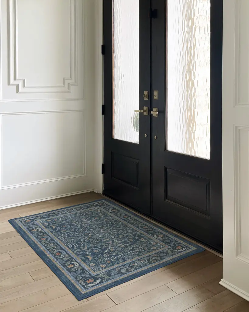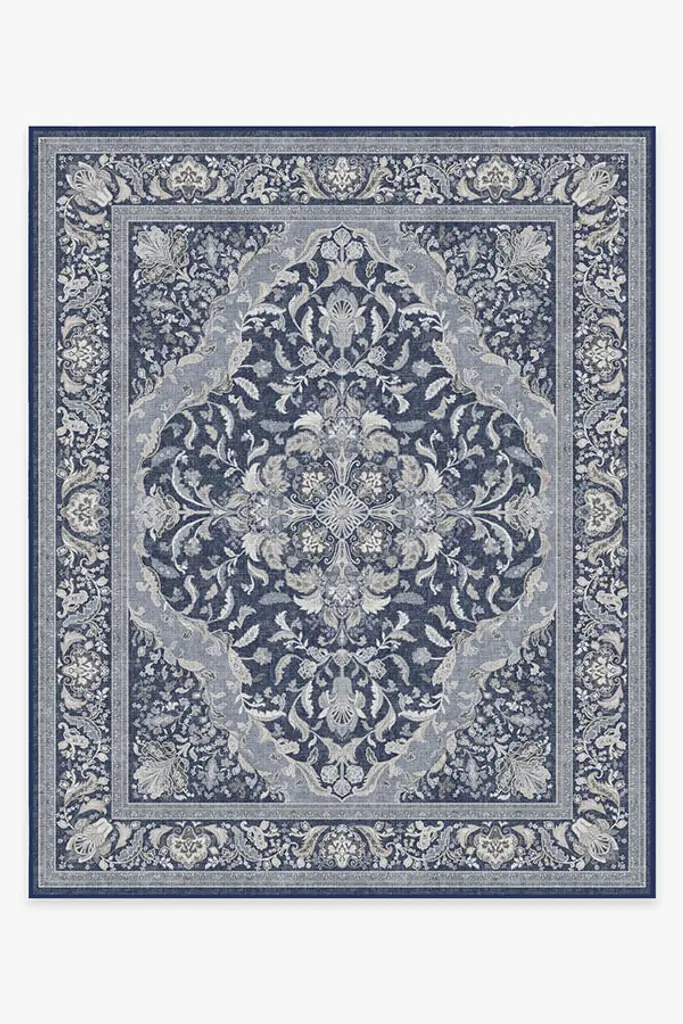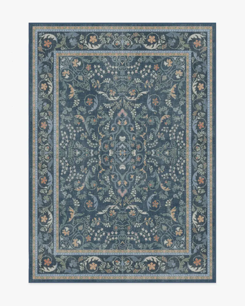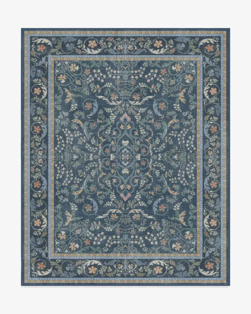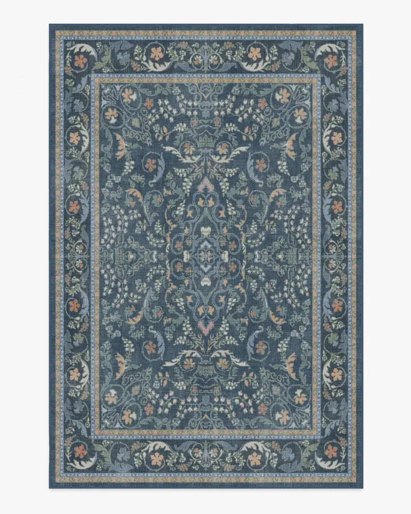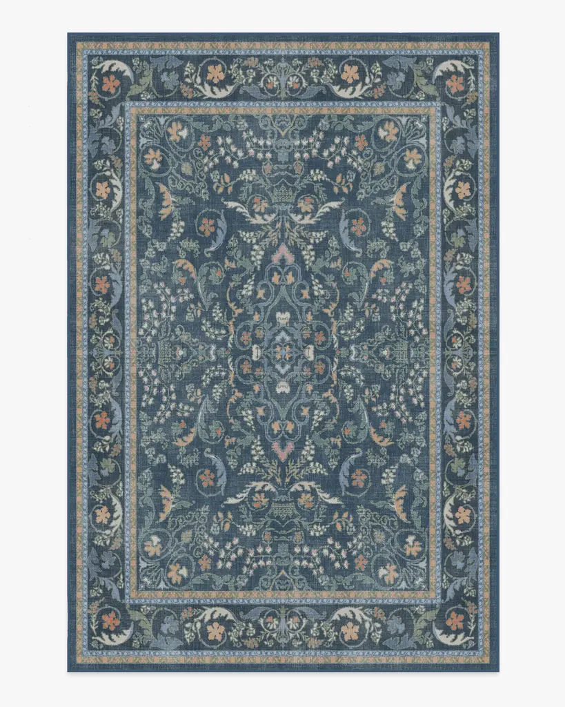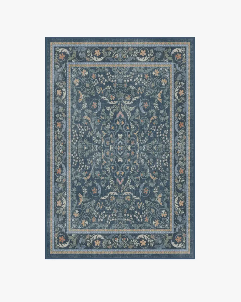Make a grand entrance with our Bridgerton Fit for a Queen Blue Multicolor Rug. Inspired by ornate and embellished Regency-era interiors, this traditional rug design has whimsical floral motifs reminiscent of royal garden parties. The antiqued and distressed style features soft marigold, sage, cream and orange blooms against a dark blue background. Water-resistant, stain-resistant, and machine-washable. Rug colors may vary slightly according to your device and the lighting in your space.