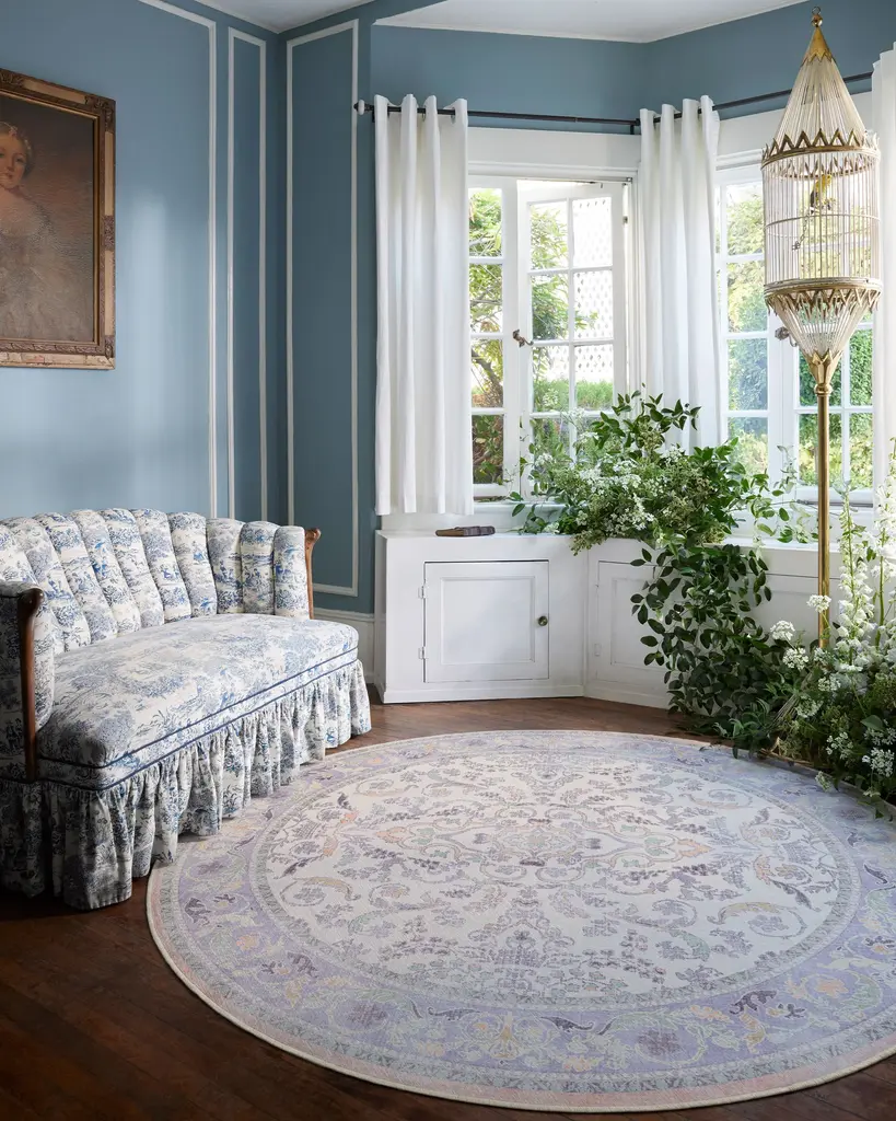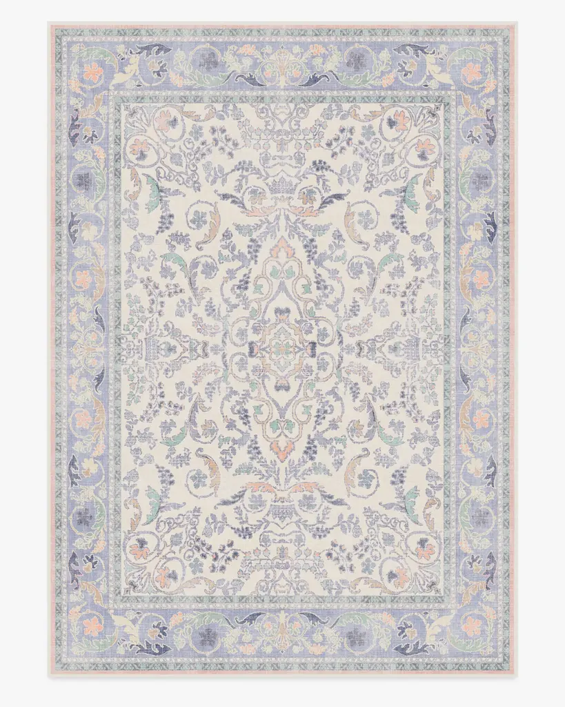 Make a grand entrance with our Bridgerton Fit for a Queen Soft Lavender Rug. Inspired by ornate and embellished Regency-era interiors, this traditional rug design has whimsical floral motifs reminiscent of royal garden parties. The antiqued and distressed style features soft lavender, blues, purples, peaches, and neutrals against a light cream background. Water-resistant, stain-resistant, and machine-washable. Rug colors may vary slightly according to your device and the lighting in your space.