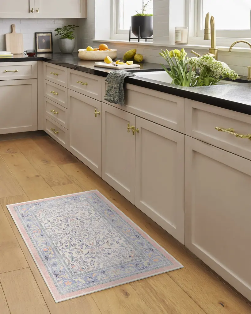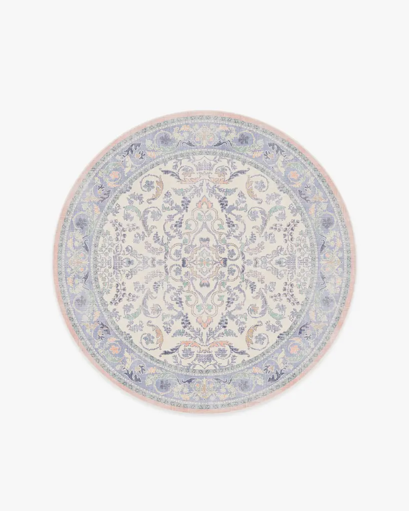 Make a grand entrance with our Bridgerton Fit for a Queen Soft Lavender Rug. Inspired by ornate and embellished Regency-era interiors, this traditional rug design has whimsical floral motifs reminiscent of royal garden parties. The antiqued and distressed style features soft lavender, blues, purples, peaches, and neutrals against a light cream background. Water-resistant, stain-resistant, and machine-washable. Rug colors may vary slightly according to your device and the lighting in your space.