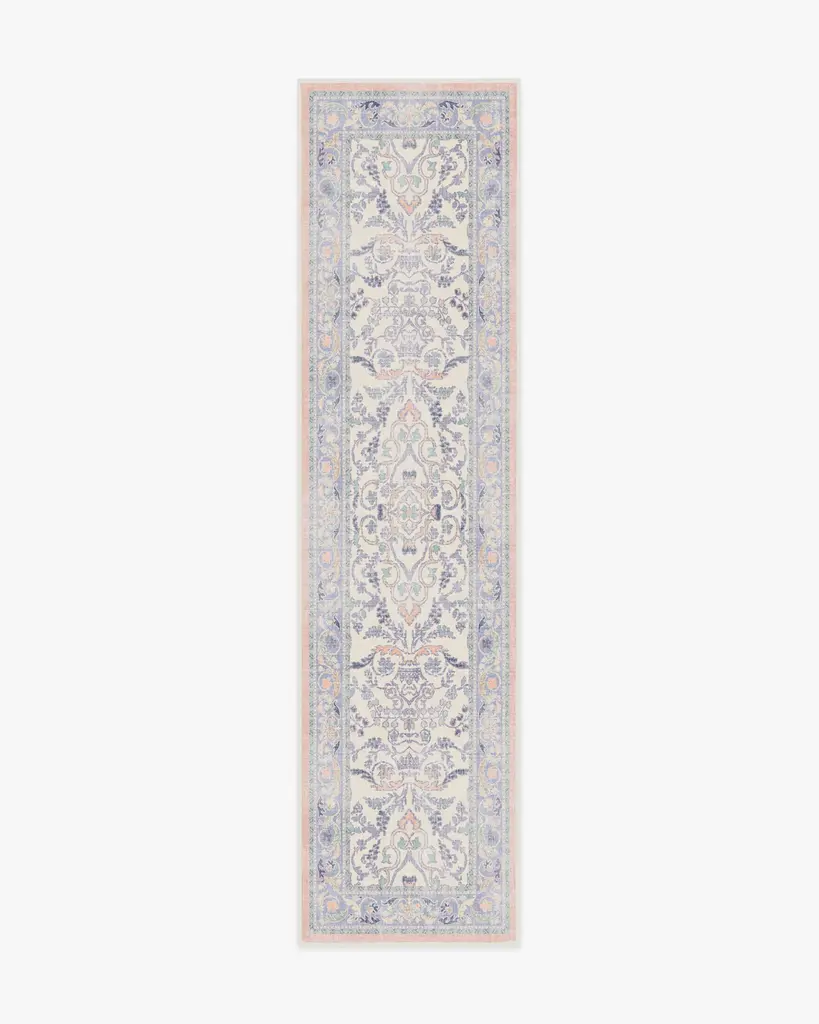Make a grand entrance with our Bridgerton Fit for a Queen Soft Lavender Rug. Inspired by ornate and embellished Regency-era interiors, this traditional rug design has whimsical floral motifs reminiscent of royal garden parties. The antiqued and distressed style features soft lavender, blues, purples, peaches, and neutrals against a light cream background. Water-resistant, stain-resistant, and machine-washable. Rug colors may vary slightly according to your device and the lighting in your space.