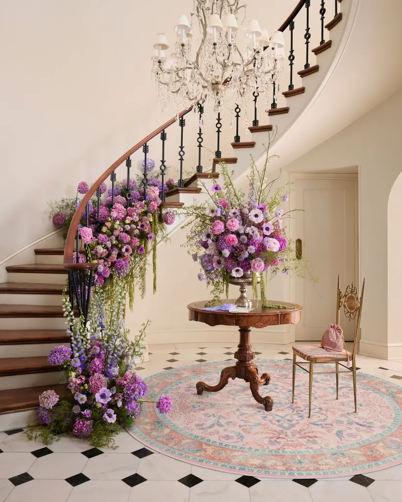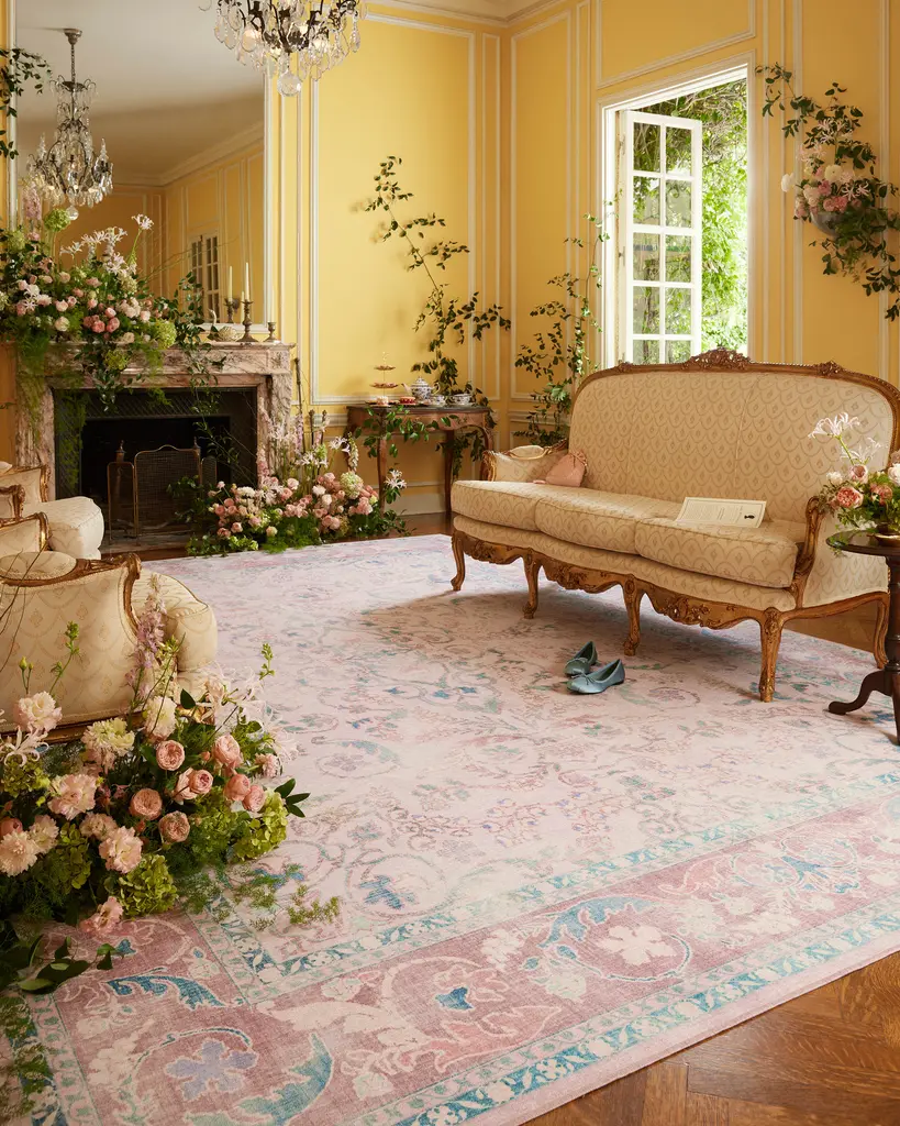 Make a grand entrance with our Bridgerton Fit for a Queen Soft Rose Rug. Inspired by ornate and embellished Regency-era interiors, this traditional rug design has lovely floral motifs reminiscent of royal garden parties. The antiqued and distressed style features soft purples, powder blues, soft rose pinks, and royal teal blues against a blush pink background. Water-resistant, stain-resistant, and machine-washable. Rug colors may vary slightly according to your device and the lighting in your space.