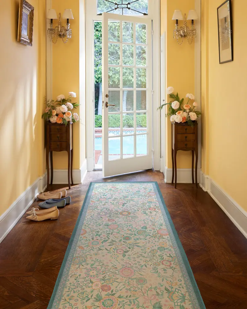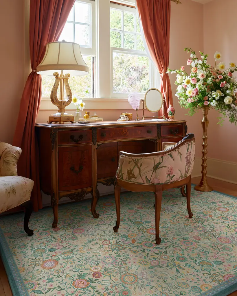 Capture the whimsy of the Bridgerton floral gardens with our Bridgerton Royal Garden Ivory & Jade Rug. Bordered by jade green, this youthful and ditzy design features a medley of fun flowers in vintage oranges, playful pinks, and soft yellows against a bright ivory background. It's the perfect rug to get swept off your feet. Water-resistant, stain-resistant, and machine-washable. Rug colors may vary slightly according to your device and the lighting in your space.