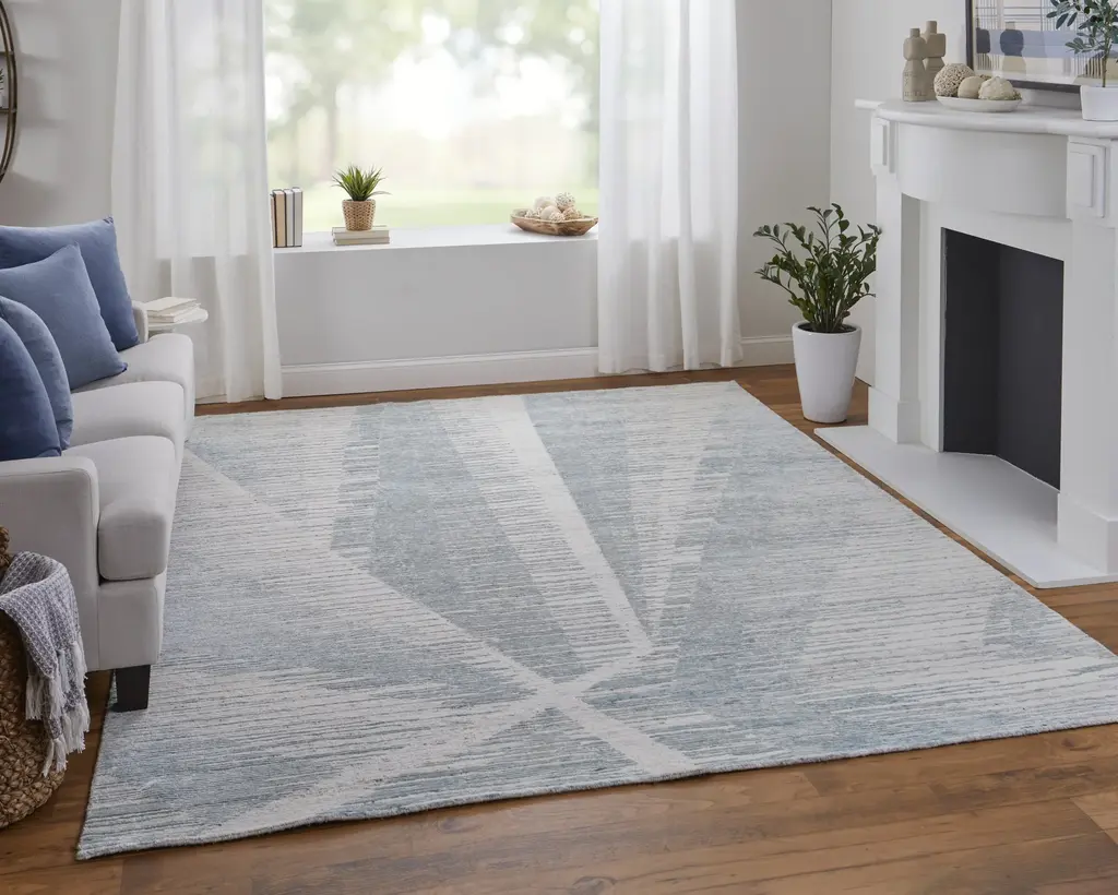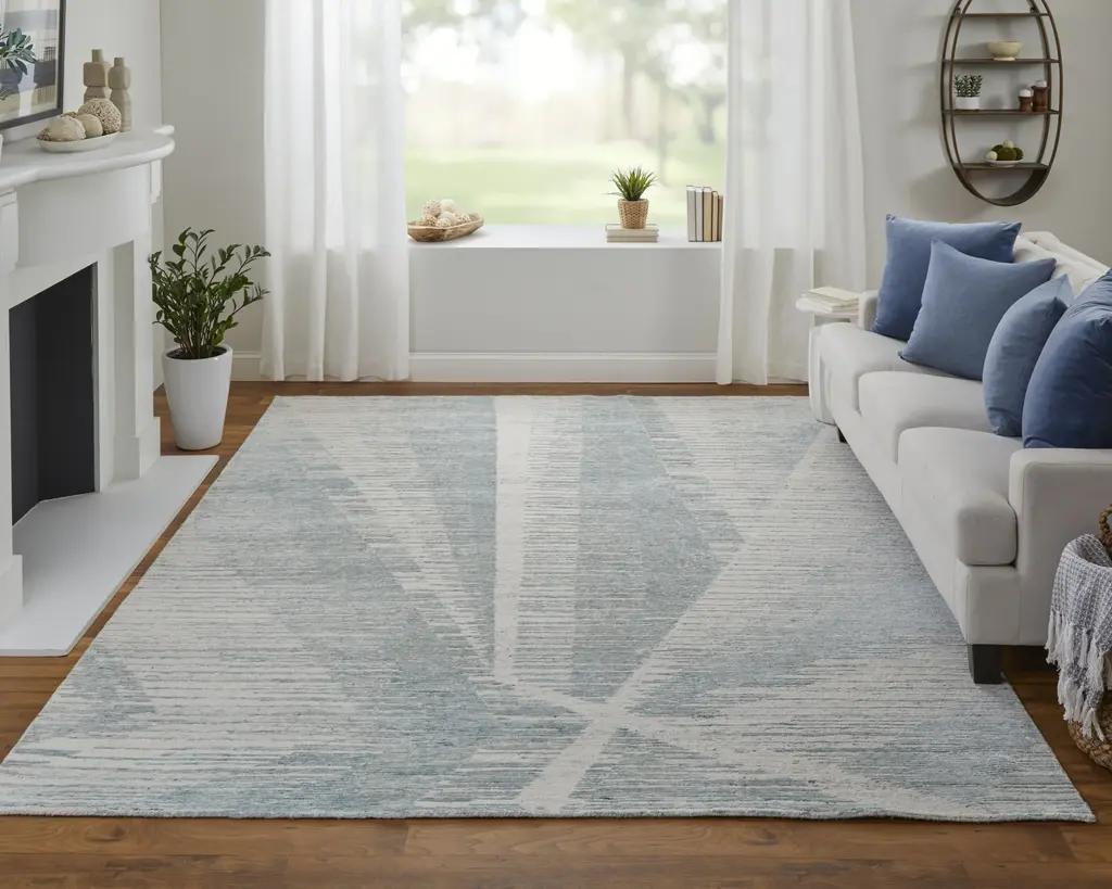 Collection: Brighton Colors: Blue, Ivory, Silver Gray Construction: Hand Knotted Material: Face: Wool, Viscose Pile: Low Pile Pile Height: 0.31" Styles: Contemporary,Casual,Transitional,Bohemian Backing: N/A Made In: India Thickness: 0.31" Price Range: $$$$$ (Premium)