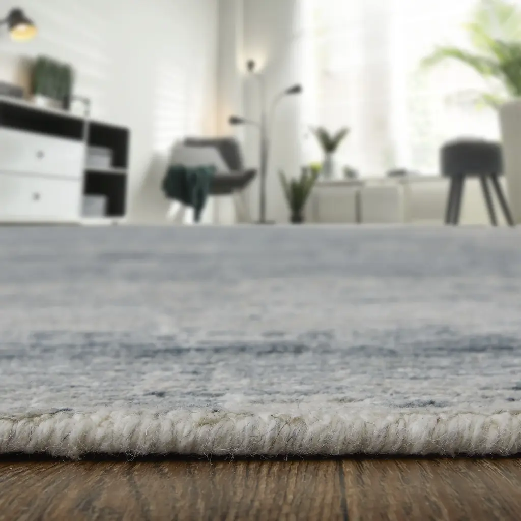Collection: Brighton Colors: Ivory, Blue, Gray Construction: Hand Knotted Material: Face: Wool, Viscose Pile: Low Pile Pile Height: 0.31" Styles: Contemporary,Industrial,Transitional,Bohemian Backing: N/A Made In: India Thickness: 0.31" Price Range: $$$$$ (Premium)