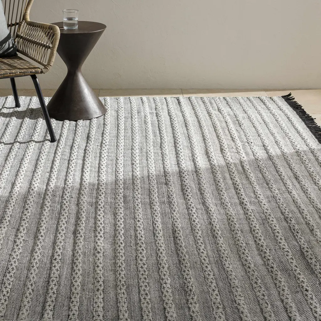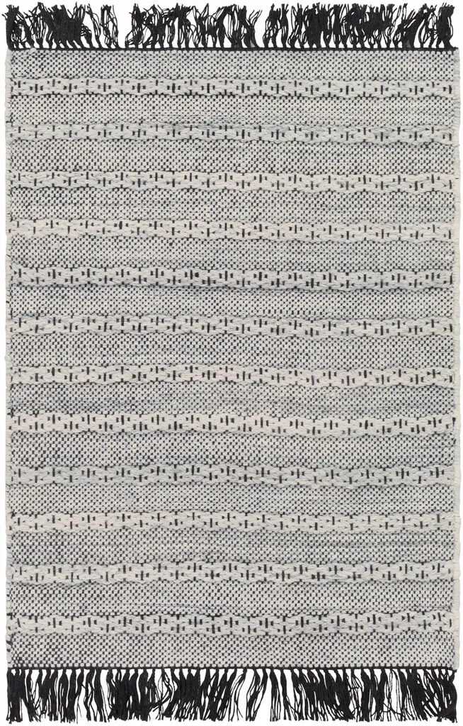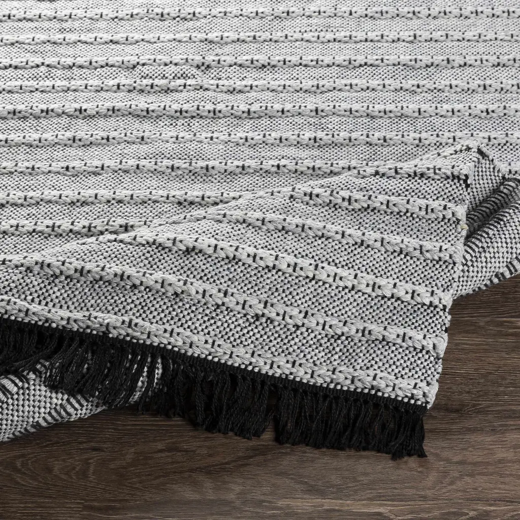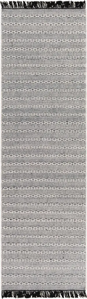 Collection: Brockman Colors: Black, Off White, Light Slate Construction: Hand Woven Material: 100% Recycled PET Yarn Pile: No Pile Styles: Contemporary Made In: India Thickness: 0.25" Fringe Length: 3" Price Range: $$$$$ (Most Affordable)