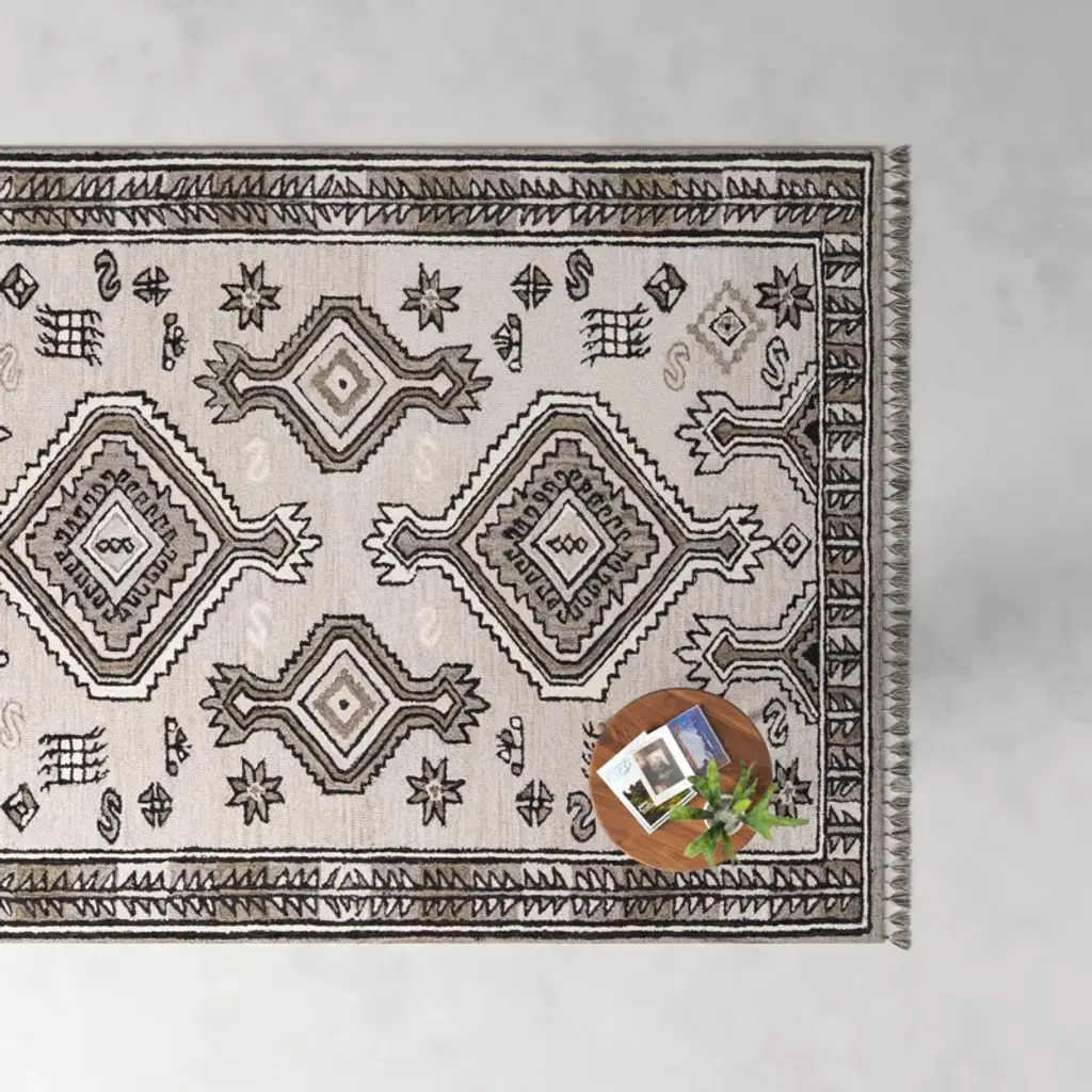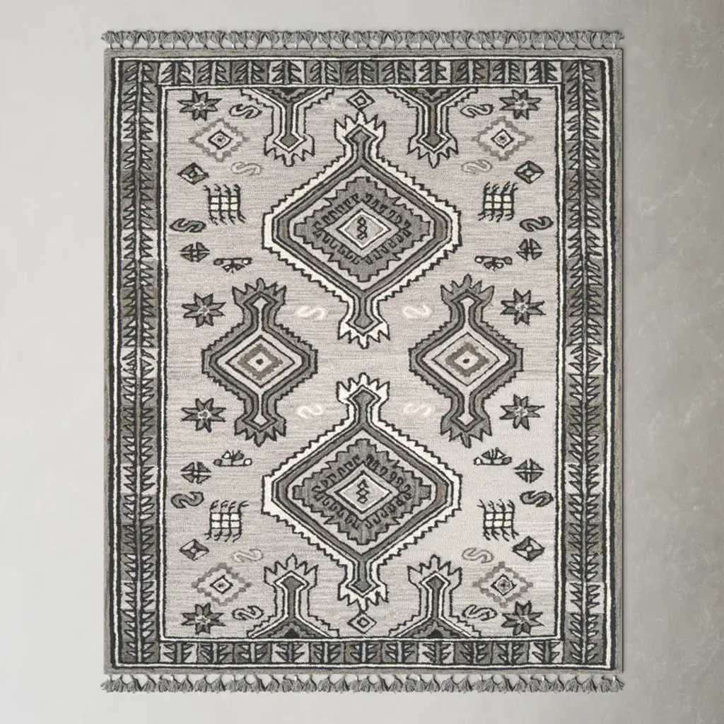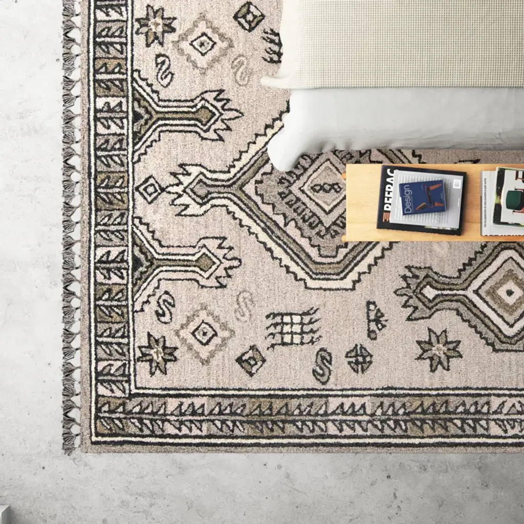 This handmade, wool area rug has a classic, rustic look to set the stage in your space. Hand-tufted from 100% wool, it offers cushion as well as organic resistance to stains and moisture. The design features a timeless repeating medallion pattern with botanical and geometric shapes in hues of gray and beige. We love how this rug's 0.4" pile height is a balance of plush and still easy to vacuum. Pair it with a rug pad to add cushion underneath and prevent slipping and sliding (sold separately).