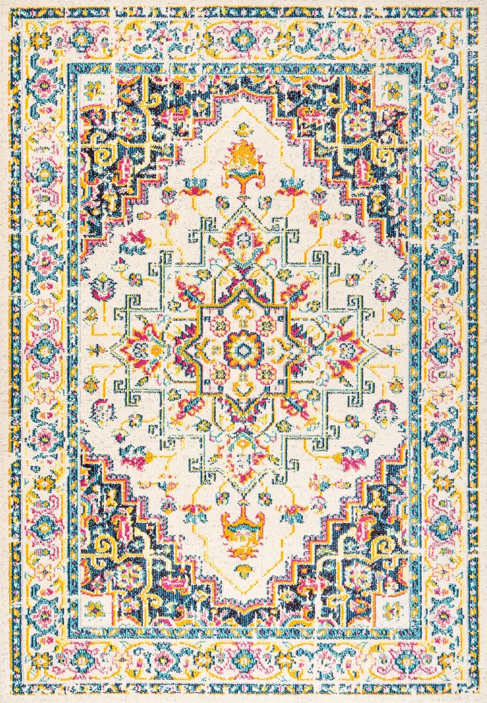 This rug's bright colors add a cheerful Bohemian touch to your modern farmhouse or cottage. With its family-friendly busy pattern, this rug is ideal for a dining room, living room, or bedroom. A geometric central medallion in ivory, surrounded by bright accent colors gives this rug standout style.