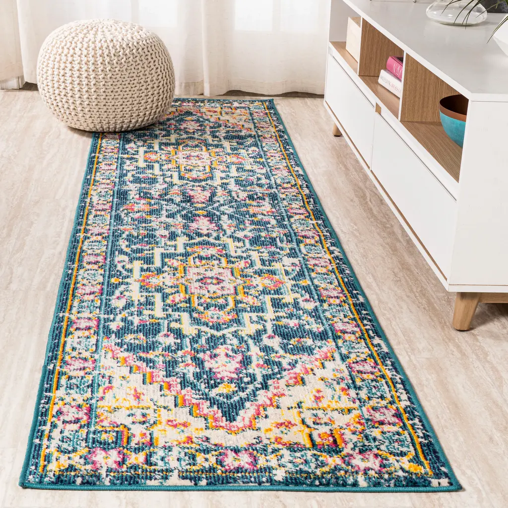 This rug's bright colors add a cheerful Bohemian touch to your modern farmhouse or cottage. With its family-friendly busy pattern, this rug is ideal for a dining room, living room, or bedroom. A geometric central medallion in ivory, surrounded by bright accent colors gives this rug standout style.
