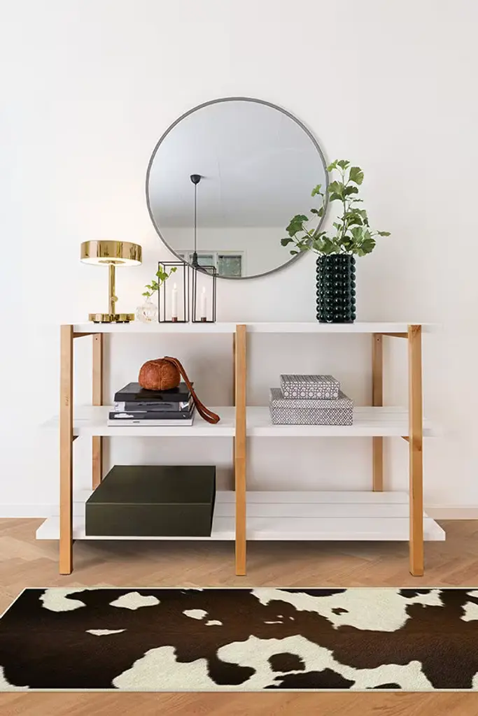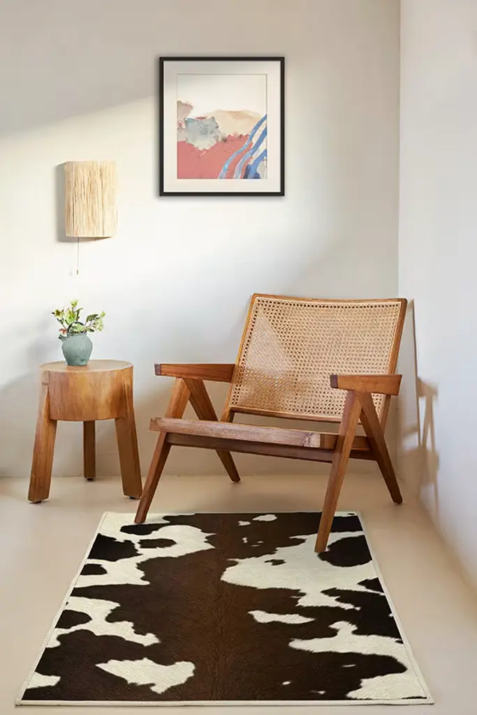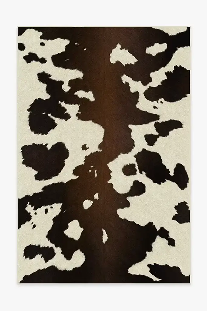 Add a touch of rustic sophistication to your space. Our Brown and Black Faux Cowhide Rug is made from a cushioned, medium-pile polyester and polyurethane material that offers the look of real hide without the inconvenience. Durable, shed-resistant, and machine-washable.