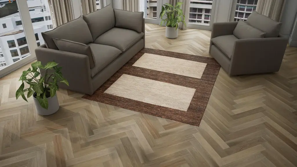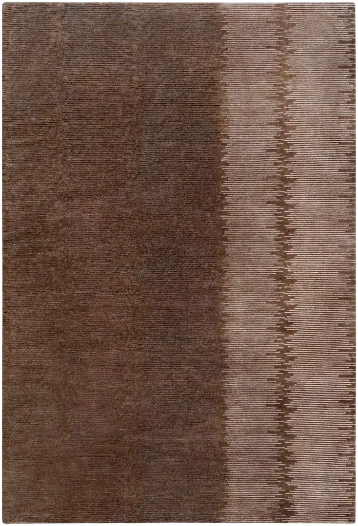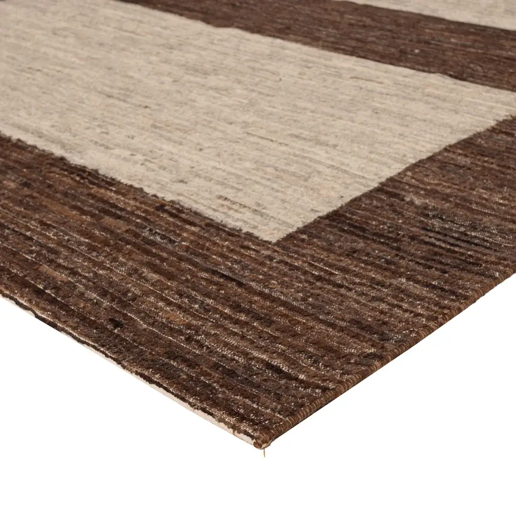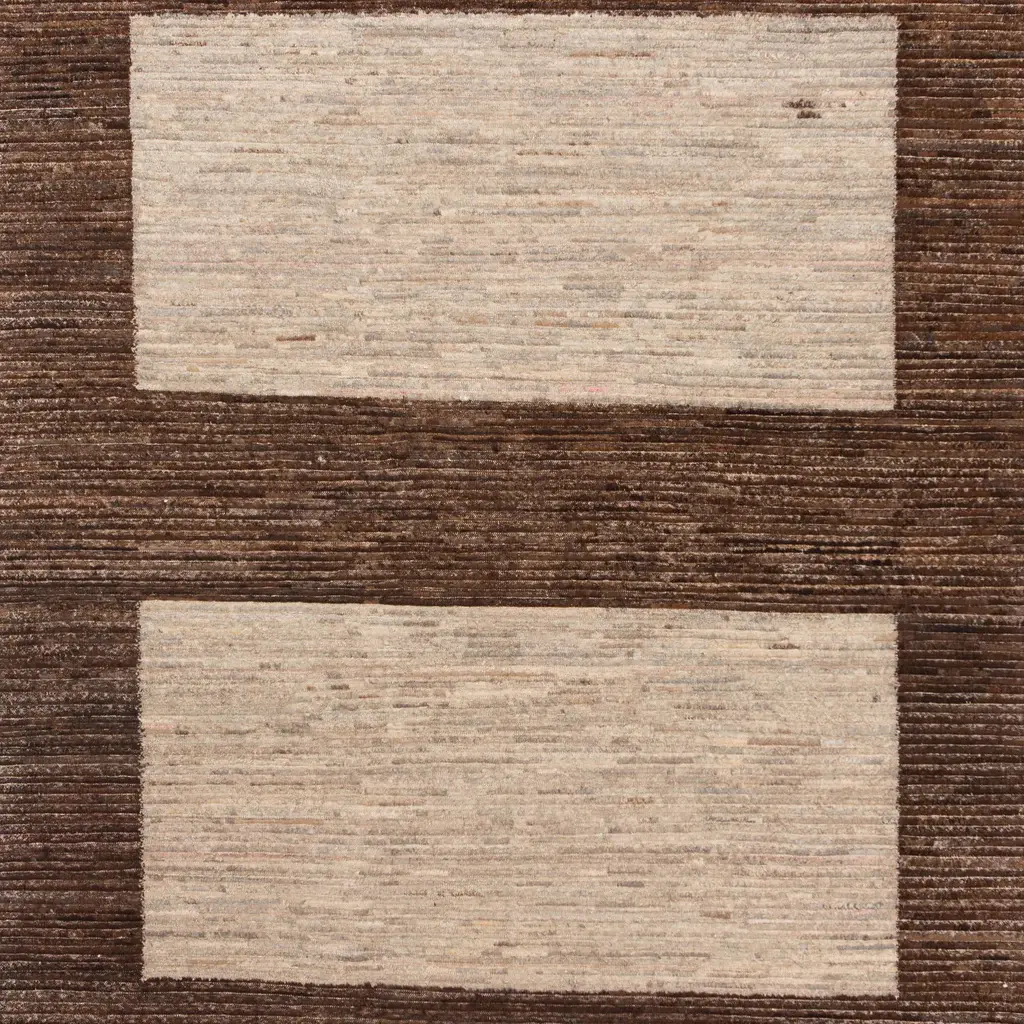 The Brown Modern Wool Contemporary rug features a minimalist geometric design with two light beige rectangles on a dark brown background. Hand-knotted in Central Asia, this high-quality wool rug adds a touch of elegance to any home decor with its textured look and contemporary flair. Size: 6'6" x 8'.