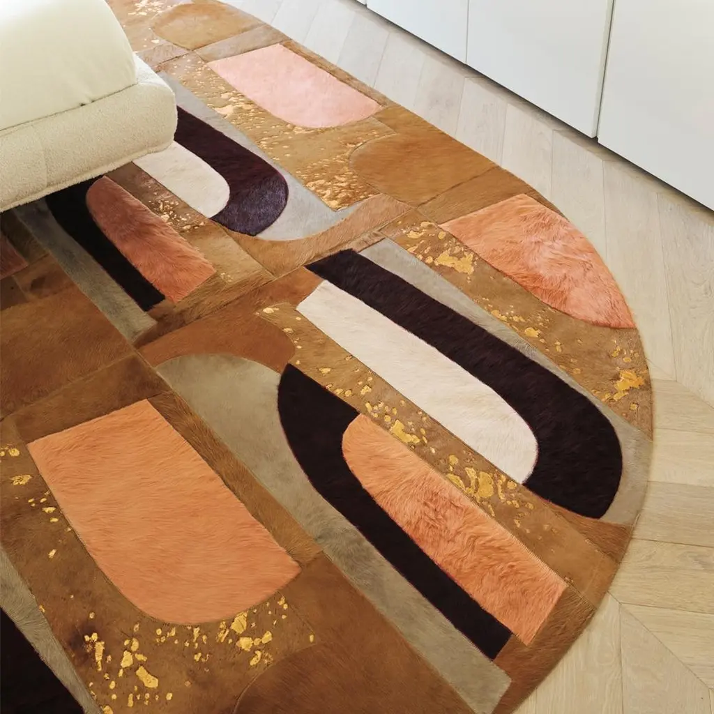 The Marabu rug was inspired by Greg Natale’s love for Brutalism. Its blocky, geometric pattern reflects the brutalist architecture of the iconic Marabu Discoteca. Marabu Warm features a striking combination of both saturated dyed tones and natural shades;Tan, Rich russet, Apricot, Caramel, Taupe and Ivory, accented with Bronze metallic.The Marabu is stitched together using commercial grade nylon thread and features a branded ribbon edge finish. It can easily be customized to any colour, size or shape.The Altro Mondo Collection is a range of hide floor and wall coverings by Greg Natale for Art Hide. Classically stylish with an unconventional twist, Altro Mondo, meaning “other world” in Italian, is inspired by the innovative architecture and radical design ethos of famous Italian discotheques from the 1970s to the 1990s. Drawing from Brutalist, Postmodernist, and Space-Age aesthetics, the collection evokes the bold spirit embodied by these otherworldly spaces. Art Hide rugs are made to order. Please allow 4-6 weeks for delivery.