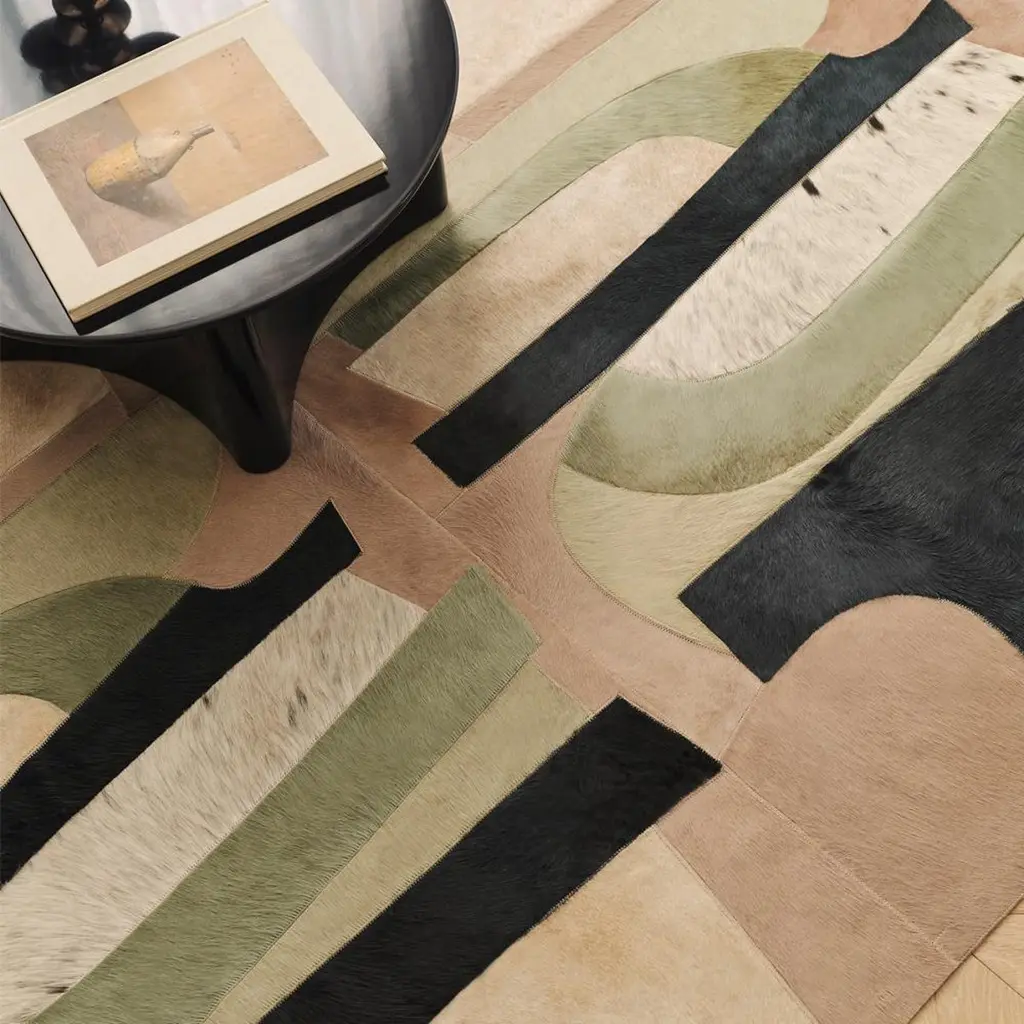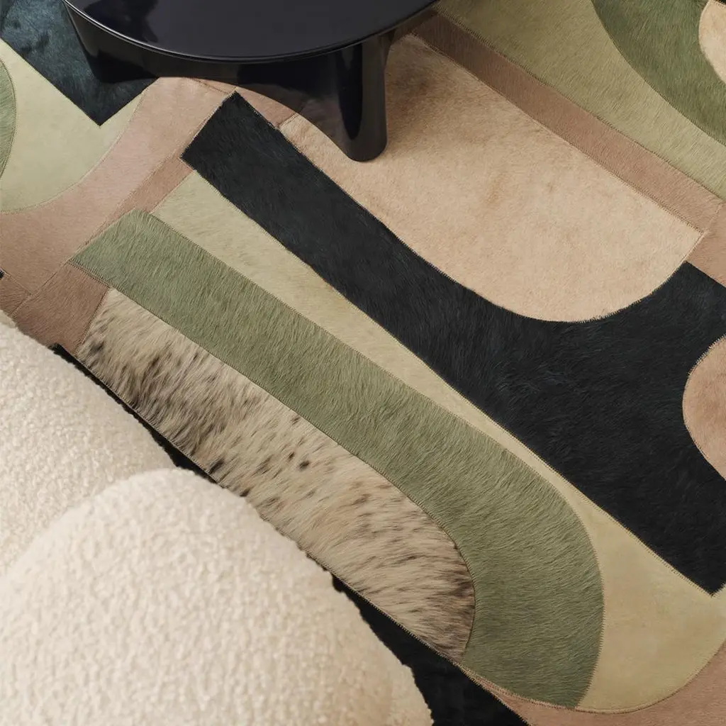 The Marabu rug was inspired by Greg Natale’s love for Brutalism. Its blocky, geometric pattern reflects the brutalist architecture of the iconic Marabu Discoteca. Marabu’s blocky, slightly surrealist design finds inspiration in Greg Natale’s appreciation for 1970s Brutalism. Available in two colourways, the Marabu rug offers a bold, artistic touch to any space.Marabu Cool features a striking combination of both saturated dyed tones and natural shades; Navy, Light Green, Grey, White Speckle and cool Tan.The Marabu is stitched together using commercial grade nylon thread and features a branded ribbon edge finish. It can easily be customized to any colour, size or shape.The Altro Mondo Collection is a range of hide floor and wall coverings by Greg Natale for Art Hide. Classically stylish with an unconventional twist, Altro Mondo, meaning “other world” in Italian, is inspired by the innovative architecture and radical design ethos of famous Italian discotheques from the 1970s to the 1990s. Drawing from Brutalist, Postmodernist, and Space-Age aesthetics, the collection evokes the bold spirit embodied by these otherworldly spaces. Art Hide rugs are made to order. Please allow 4-6 weeks for delivery.